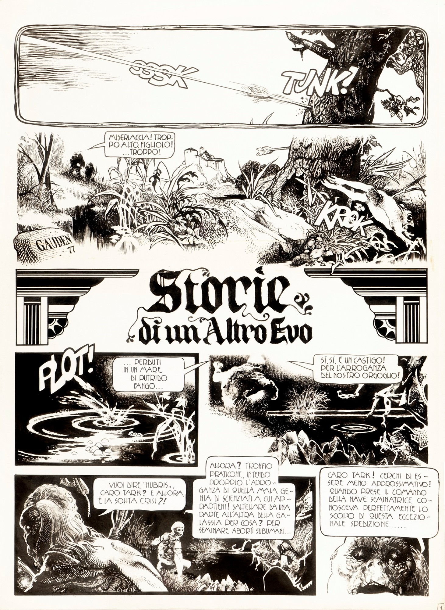 Title page originale realizzata da Gaudenzi per il primo episodio della celebre saga "Storie di un altro evo", edita per la prima volta sulle pagine della rivista Il Mago nel 1977. Un vero e proprio virtuosismo grafico di Gaudenzi che in queste pagine attinge a piene mani dall'insegnamento di mostri sacri del fumetto come Battaglia e Moebius. Firmata e datata.