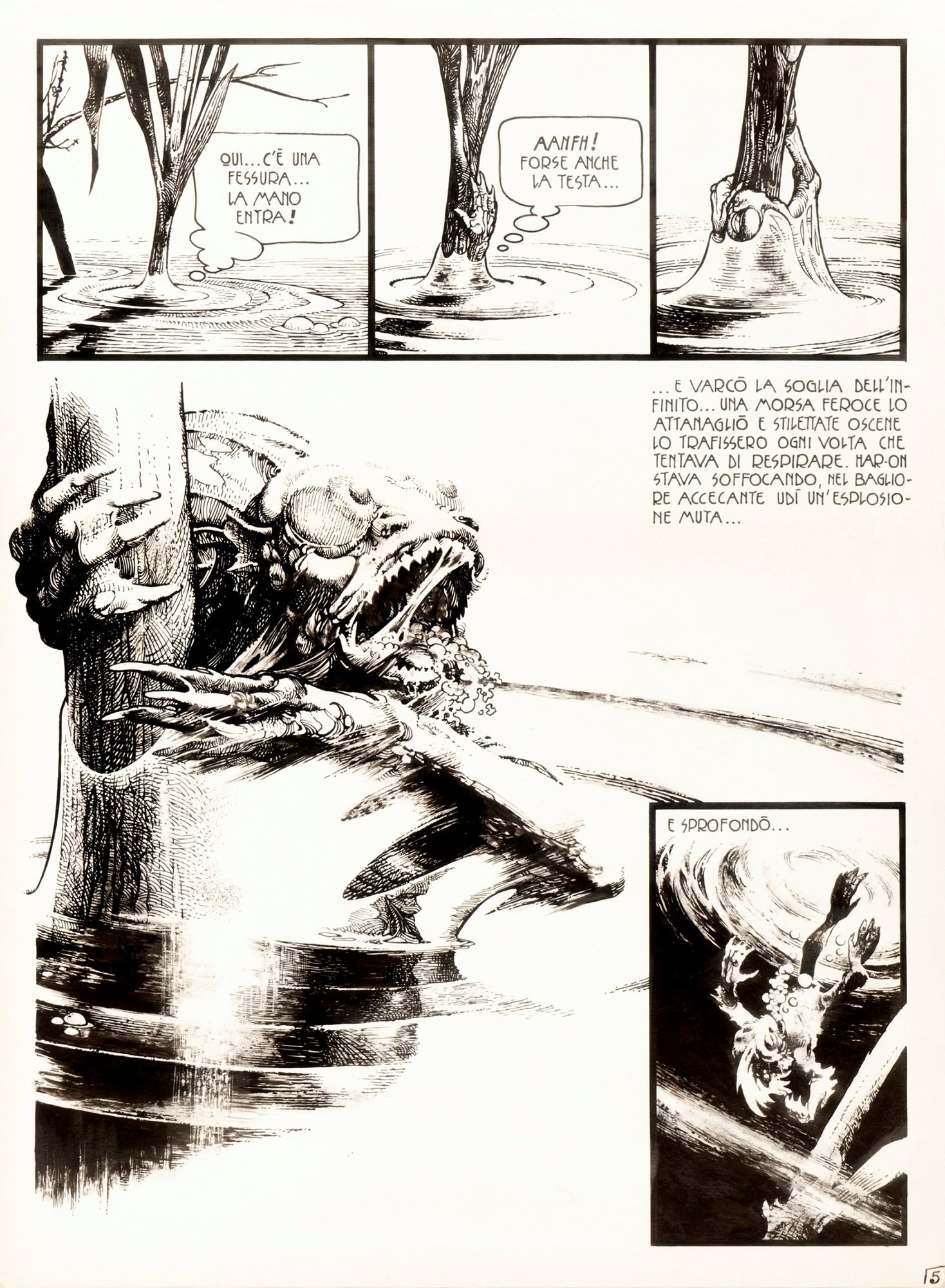 Tavola originale realizzata da Gaudenzi per la pag. 5 del primo episodio della celebre saga "Storie di un altro evo", edita per la prima volta sulle pagine della rivista Il Mago nel 1977.