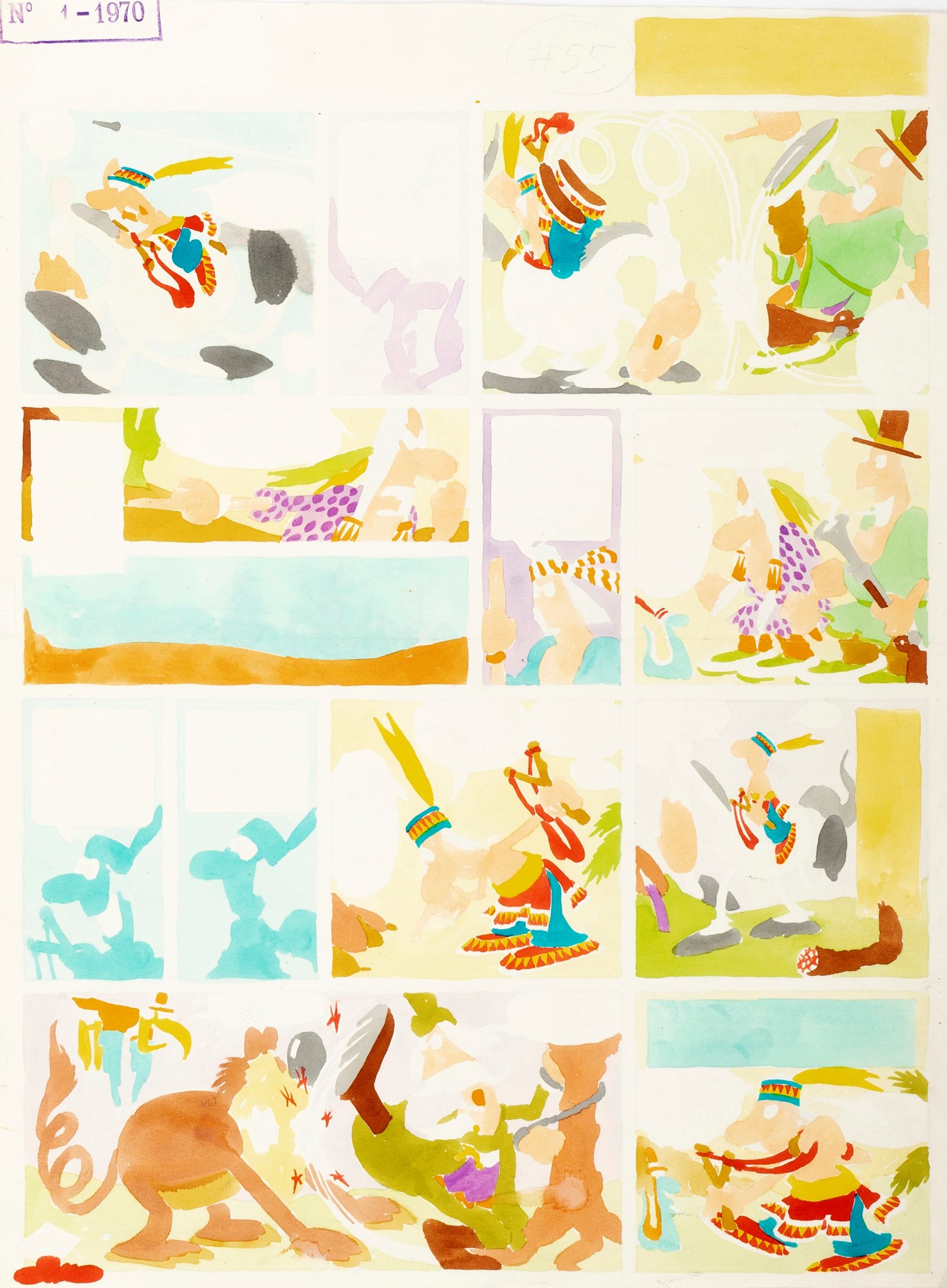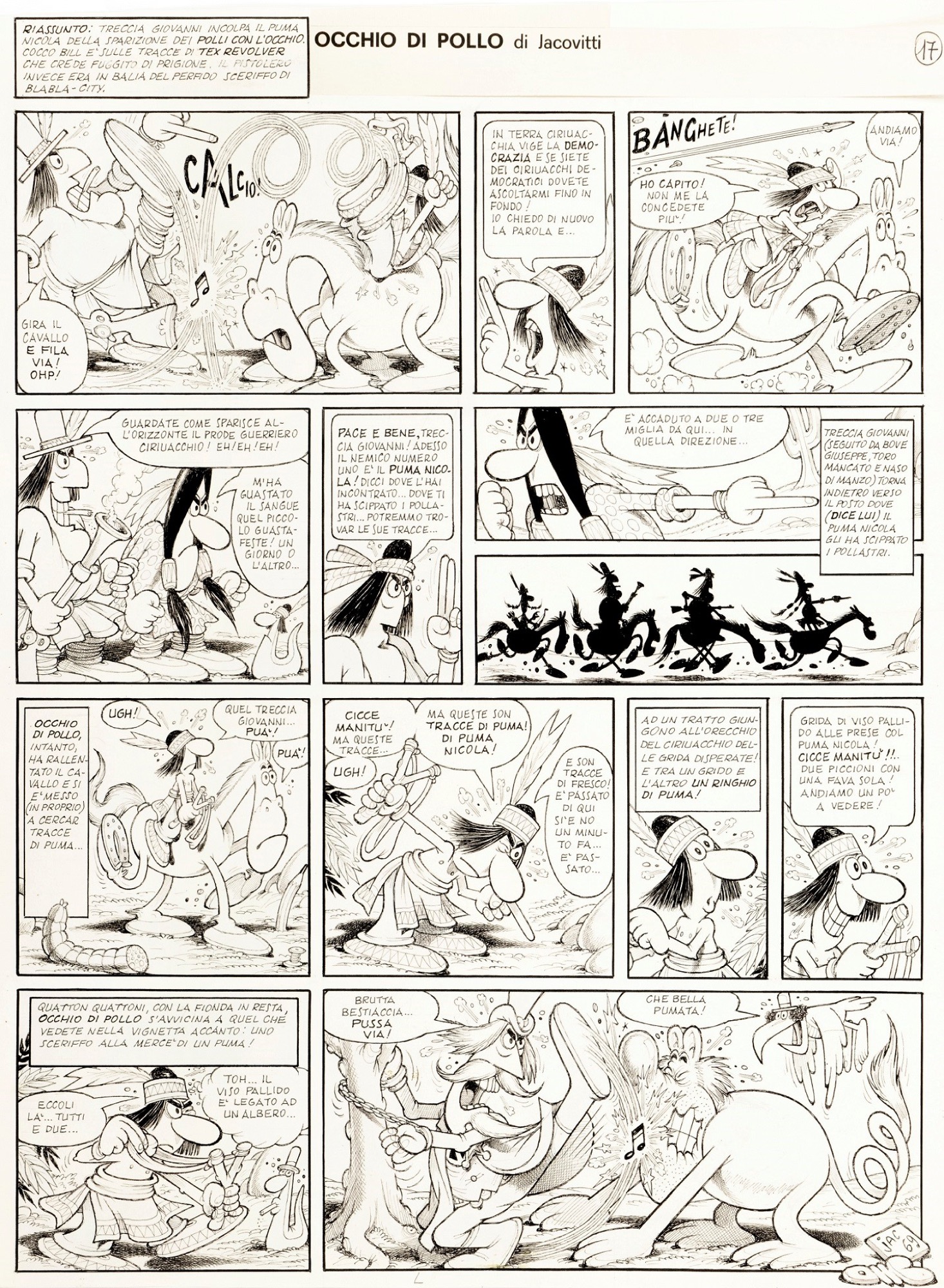 Tavola originale realizzata da Jacovitti per la ventiquattresima avventura di Cocco Bill intitolata "Occhio di Pollo e... i polli con l'occhio", pag. 17 edita per la prima volta sulle pagine del CdP n. 1 del 1970. Acquerellata con timbro editoriale al retro. Firmata e datata con lisca di pesce.