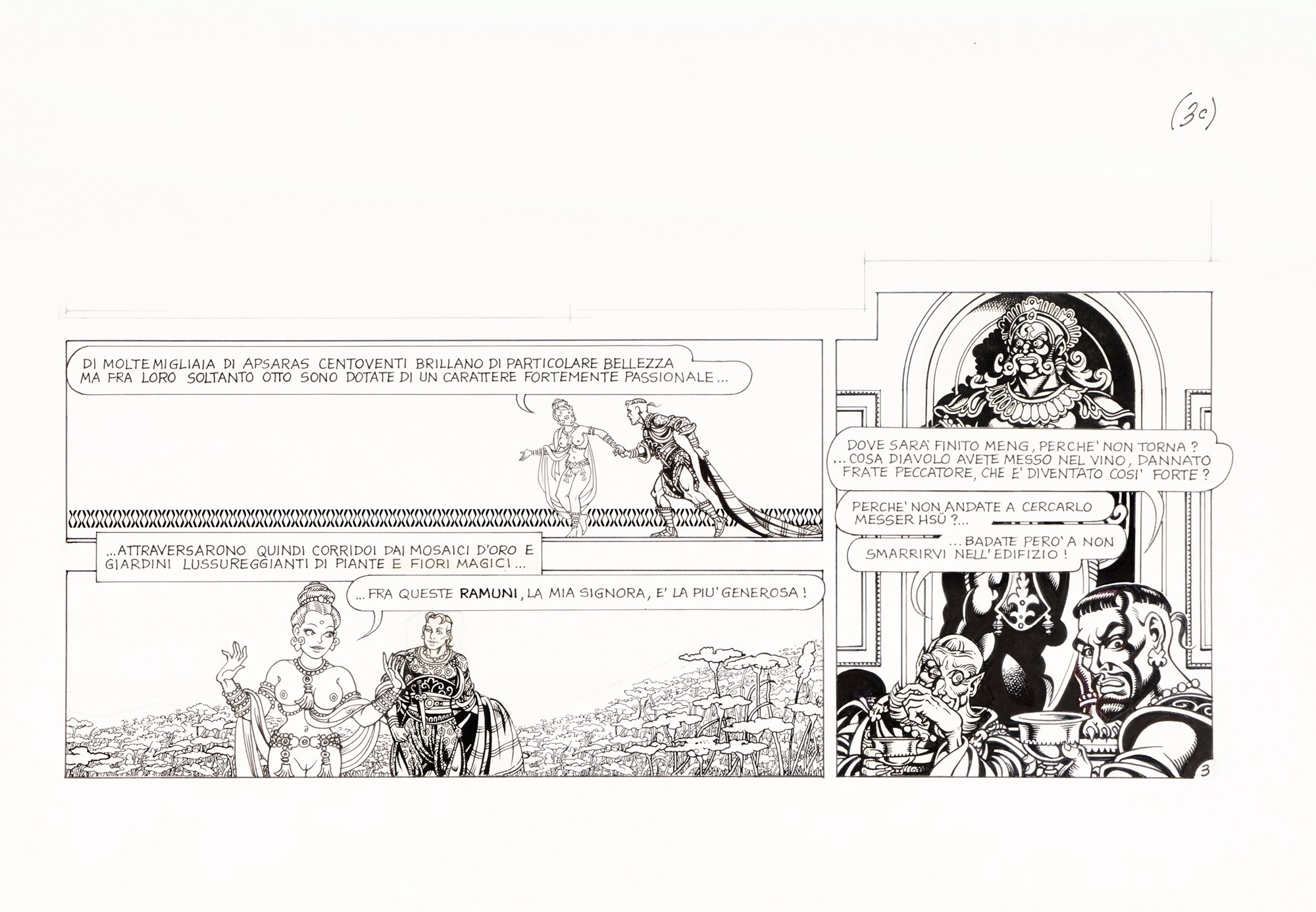 Tavola originale realizzata da Magnus per la parte inferiore della pag. 3 de "Il muro dipinto", novella facente parte del ciclo de Le Femmine Incantate, edita per la prima volta sulla rivista Dolce vita n. 1 nell´Ottobre 1987. Nella seconda vignetta il prato e il corpo di Meng sono in fotocopia, così come nella terza vignetta la parte alta della statua e il busto del frate. Unanimemente riconosciuto come il capolavoro assoluto del maestro bolognese, Le Femmine Incantate raccolgono sette brevi novelle incentrate sul tema della femminilità e ispirate da un volume di racconti cinesi di fine ´600. Un´opera museale che ci dà la possibilità di apprezzare come non mai l´amore e la fatica che Magnus riversò in ogni singola vignetta della sue Femmine. " Ho preso lo spunto da una serie di novelle, I Racconti Fantastici di Liao, completamente diverso da Le Femmine Incantate. Ci sono storie molto belle di fantasmi e apparizioni, storie buffe, storie di monaci. Ho enucleato alcune figure femminili e le ho rielaborate, restando però fedele allo spirito complessivo. Spesso si tratta di due o più racconti combinati. In più c´è tutta una mia storia personale. " (Magnus)