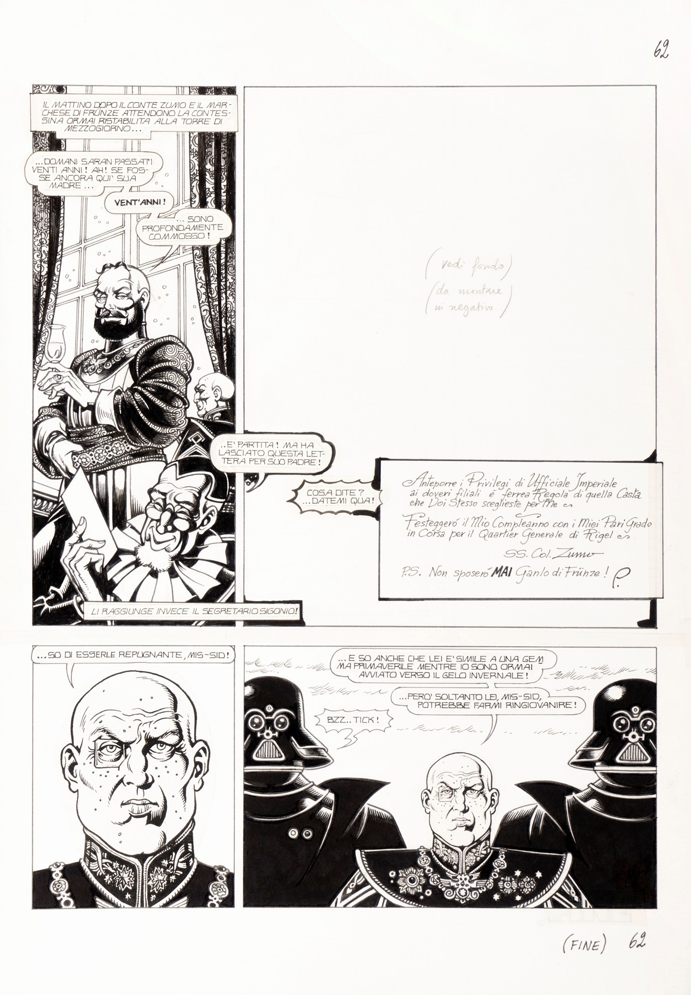 Tavola originale realizzata da Magnus per la pagina finale di "Milady nel 3000" edita per la prima volta sulla rivista Il Mago nel 1980. "Nell'universo di Milady non volevo gente comune, nè mostri extraterrestri, nè alieni di nessun tipo. Mettevo unicamente in scena l'aristocrazia terrestre e la immaginavo all'apogeo del proprio splendore, padrona di ogni parte del cosmo,sparsa nella suprema vastità celeste. Senza più problema alcuno, se non gli intrighi, i tradimenti, i complotti che si tessevano nelle corti italiane del Cinquecento, all'ombra del potere. In una dimensione di veleno e di pugnali sullo stile del Mantello Scarlatto." (Magnus). Il volto del Segretario Sigonio nelle ultime due vignette è in fotocopia.