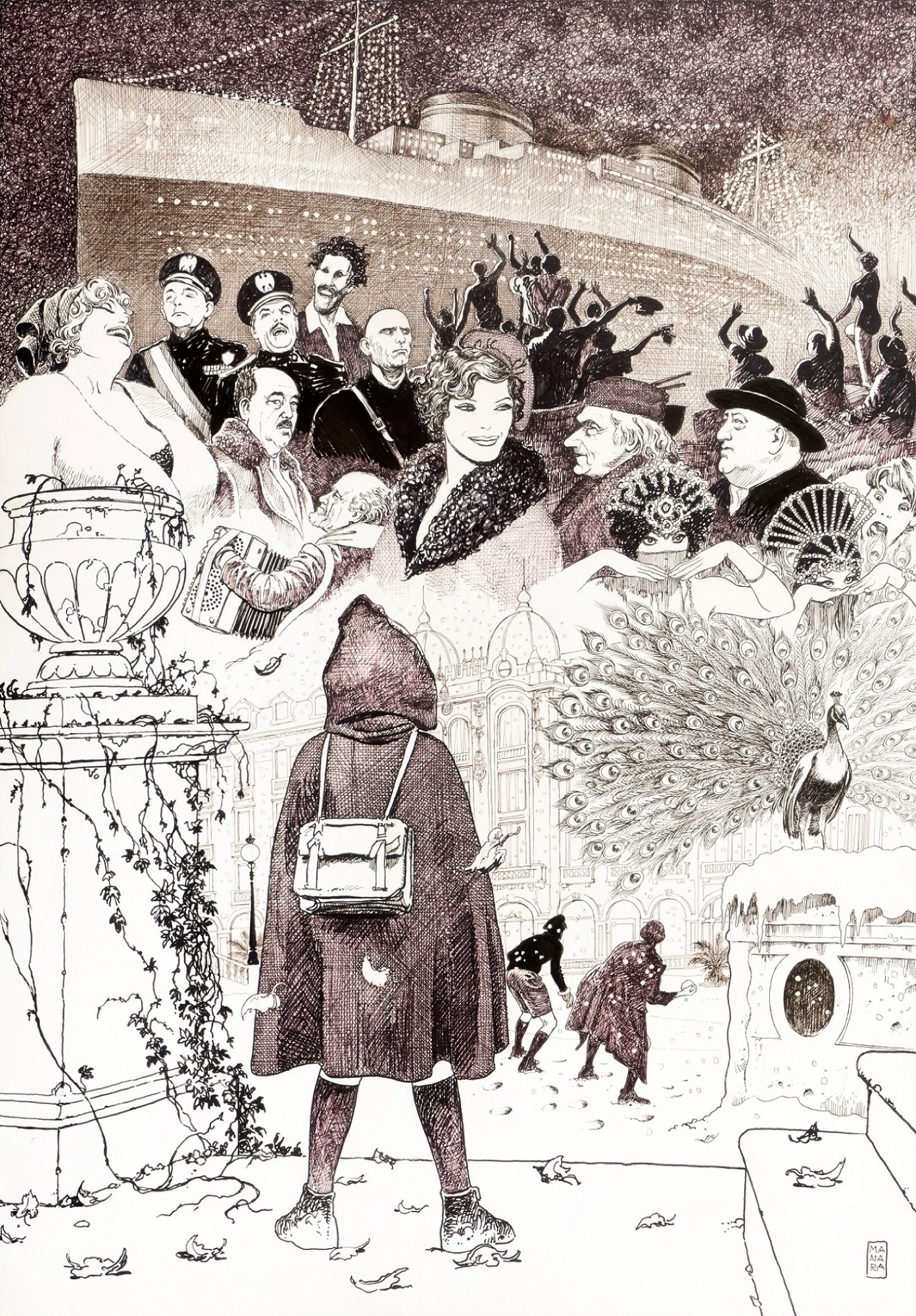 Illustrazione originale di grande formato realizzata da Manara nel 2000 per le scenografie della nave "Fellini" di Costa Crociere, pubblicata successivamente all'interno del portfolio "Milo Manara: Fellini" dagli Editori del Grifo nel 2003. Un'opera mastodontica sia per dimensioni che per valenza artistica, un omaggio di Manara al suo amico e collega Fellini, in quella che è sicuramente la scena più iconica del suo cinema. Firmata con timbro dell'autore al retro.