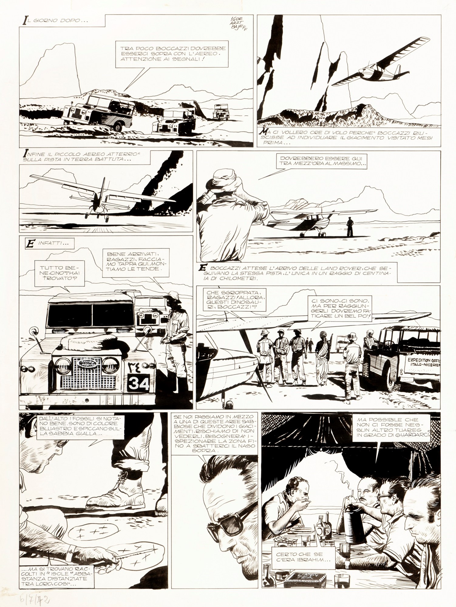 Tavola originale realizzata da Micheluzzi per "Il furto dei dinosauri", edita per la prima volta sulle pagine del CdR n. 38 a pag. 4 nel 1972. Firmata.