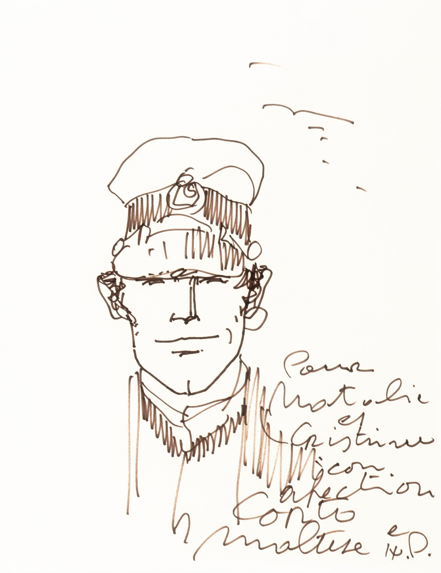 Dedicace originale realizzata da Pratt negli anni '70. Opera presente sul sito www.archivespratt.com. Provenienza: Coutau Begarie, lotto n. 217 Bandes Dessinées 09 décembre 2006. Firmata e dedicata.