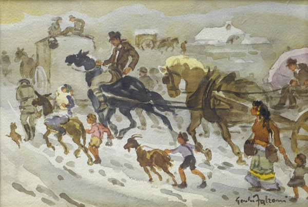 Giulio Falzoni (Marmirolo, 1900 - 1978) ZINGARI IN MARCIA Acquarello su carta, cm. 25x35 Timbro della Galleria d’Arte Pedrani - Legnano (MI). Firma in basso a destra.