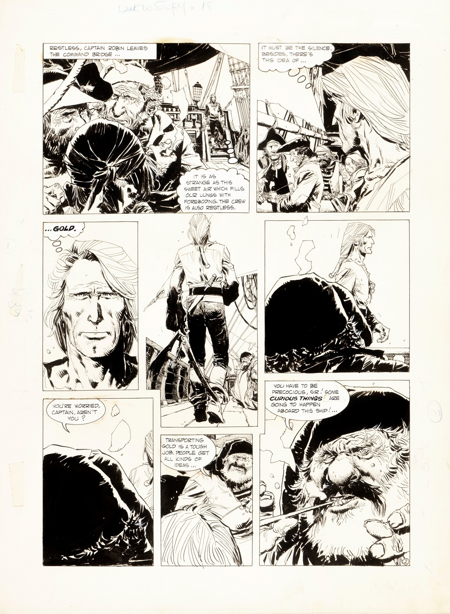 Tavola originale realizzata da Breccia per il cap. 1 pag. 2 della celebre saga fantascientifica "Robin delle stelle", pubblicata per la prima volta in Italia sulla rivista Lanciostory n. 15 dalla Eura Editoriale nel 1978. Avventura ristampata in Argentina con il titolo "El Peregrino de las estrellas - Un agujero en el mar" su Skorpio n. 55 nel 1979. Testi di Carlos Trillo.
