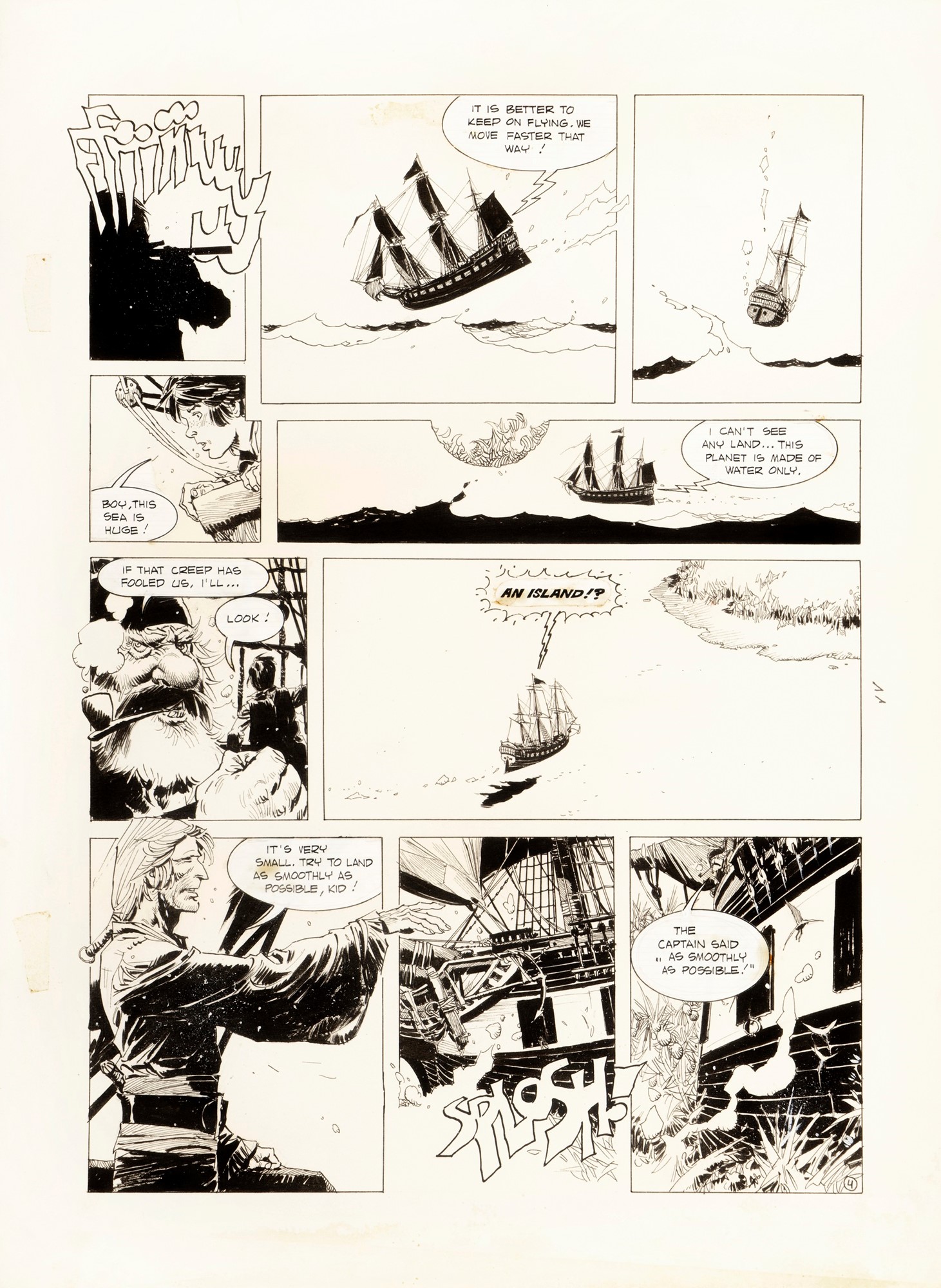 Tavola originale realizzata da Breccia per il cap. 3 pag. 4 della celebre saga fantascientifica "Robin delle stelle", pubblicata per la prima volta in Italia sulla rivista Lanciostory n. 22 dalla Eura Editoriale nel 1978. Avventura ristampata in Argentina con il titolo "El Peregrino de las estrellas - El planeta de los semejantes" su Skorpio n. 57 nel 1979. Testi di Carlos Trillo.