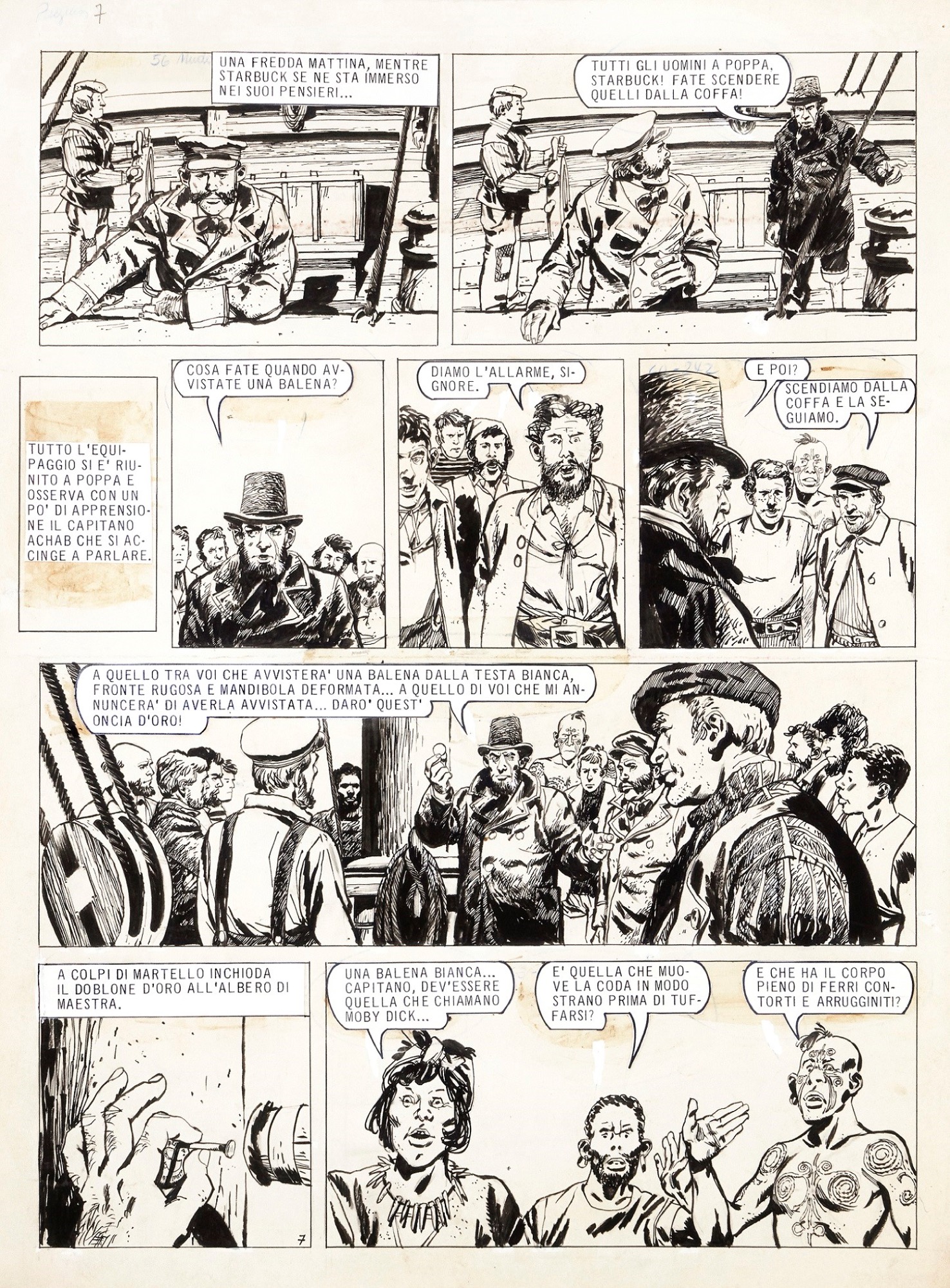 Tavola originale realizzata da Durañona per la pag. 7 di "Moby Dick", commissionata dall’editore argentino David Lipszyc nel 1968, ma pubblicata solo successivamente dall’Editorial Record nel 1977. Pubblicata per la prima volta in Italia sulle pagine di Lanciostory anno V n. 7 nel 1979. Piega orizzontale al centro.