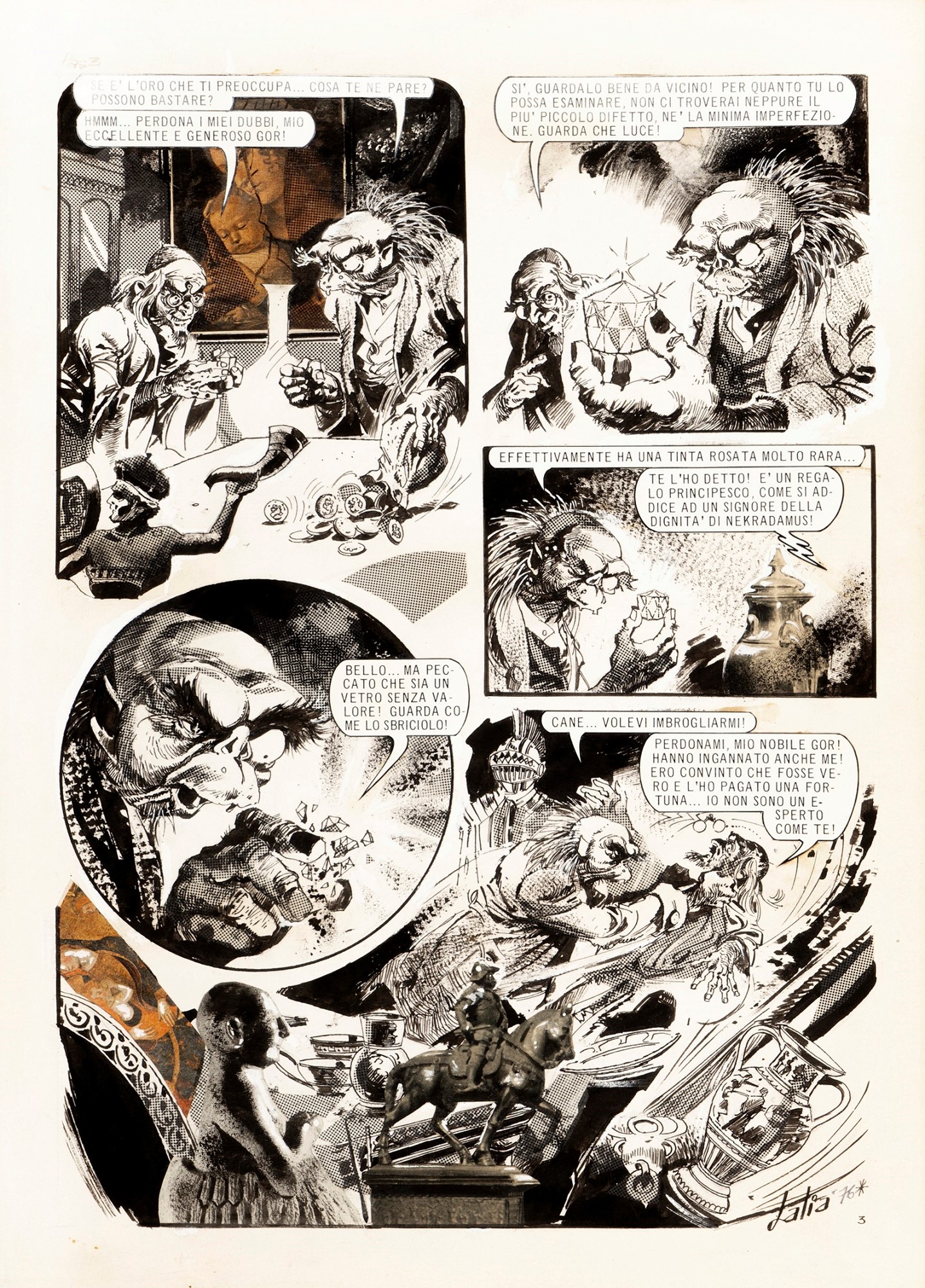Tavola originale realizzata da Lalia per la pag. 3 di "De venenos crueles y dagas malditas", episodio della celebre saga gotica Nekradamus edita per la prima volta in Argentina su Skorpio Libro de Oro n. 2 nel dicembre del 1976. Testi di Héctor G. Oesterheld. Firmata e datata.