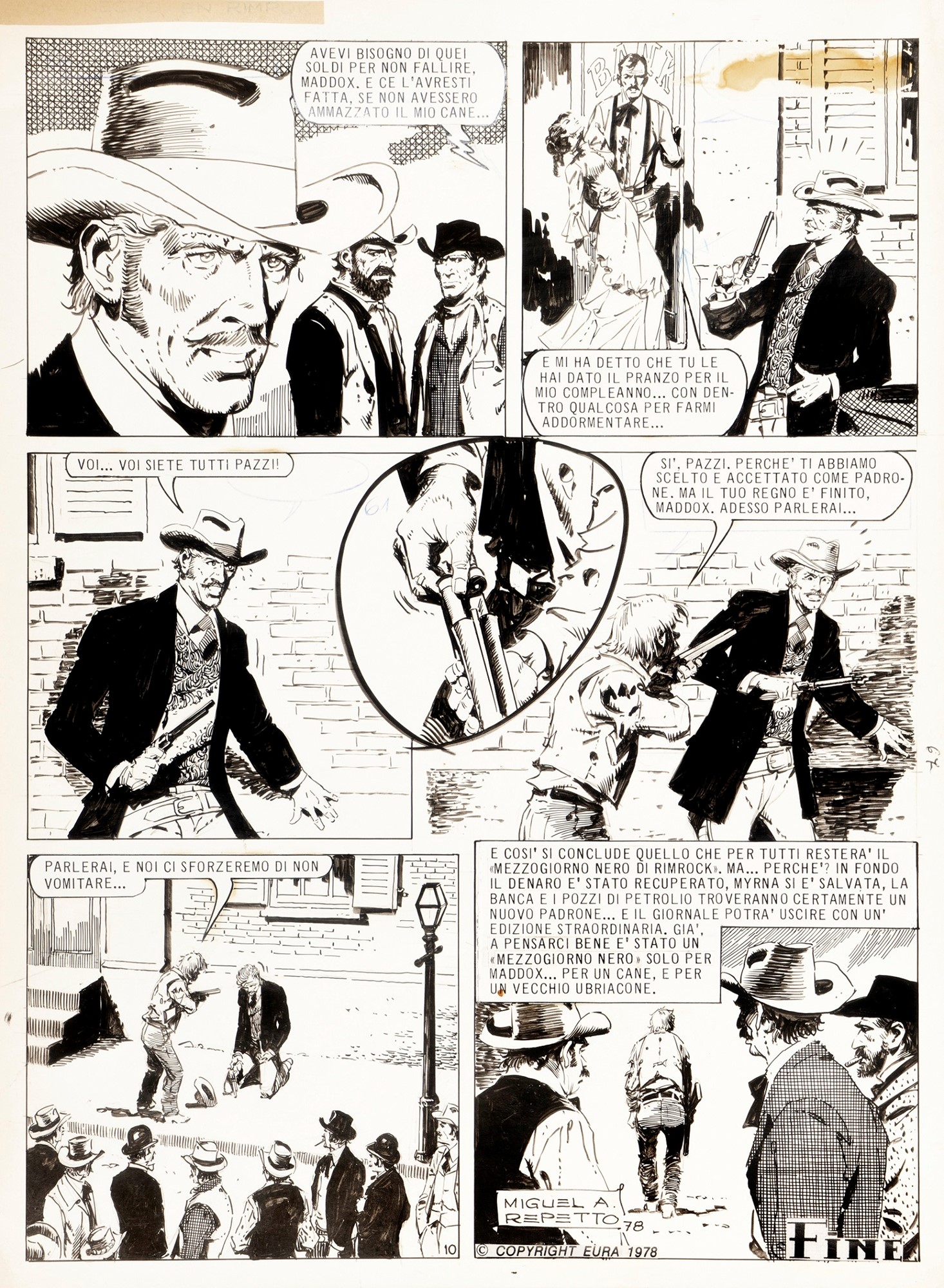 Tavola originale realizzata da Repetto per "Dia negro en Rimrock", pag. 10 di questa avventura di El Cobra edita per la prima volta in Argentina nel 1978. Firmata e datata.