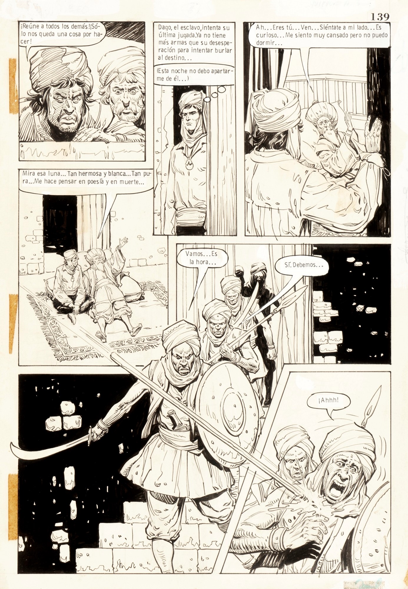 Tavola originale realizzata da Salinas per "La morte di Hussein Bey", edita su Dago n. 19 a pag. 6 e pubblicata per la prima volta in Argentina con il titolo "Destino de una noche de luna" sulla rivista Nippur Magnum Anuario n. 3 dalla Editorial Columba nel Dicembre del 1982.