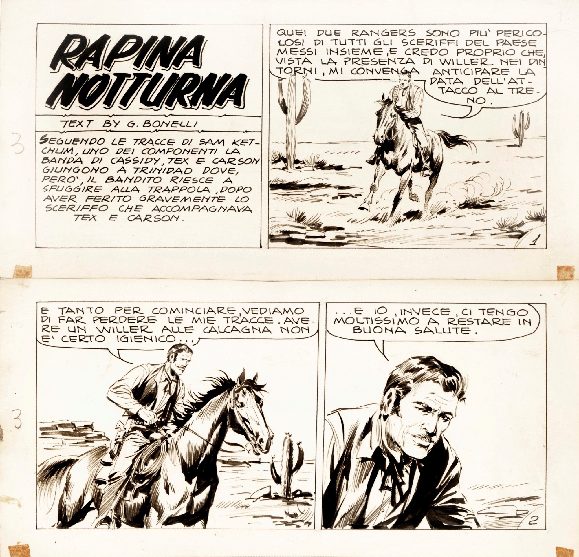 Title page originale realizzata da Galep per "Rapina notturna", edita per la prima volta nel formato a striscia nella Serie Osages n. 3 nel 1963 e successivamente ristampata su Tex n. 61 a pag. 21 dalla Bonelli nel 1965. Su due pannelli.