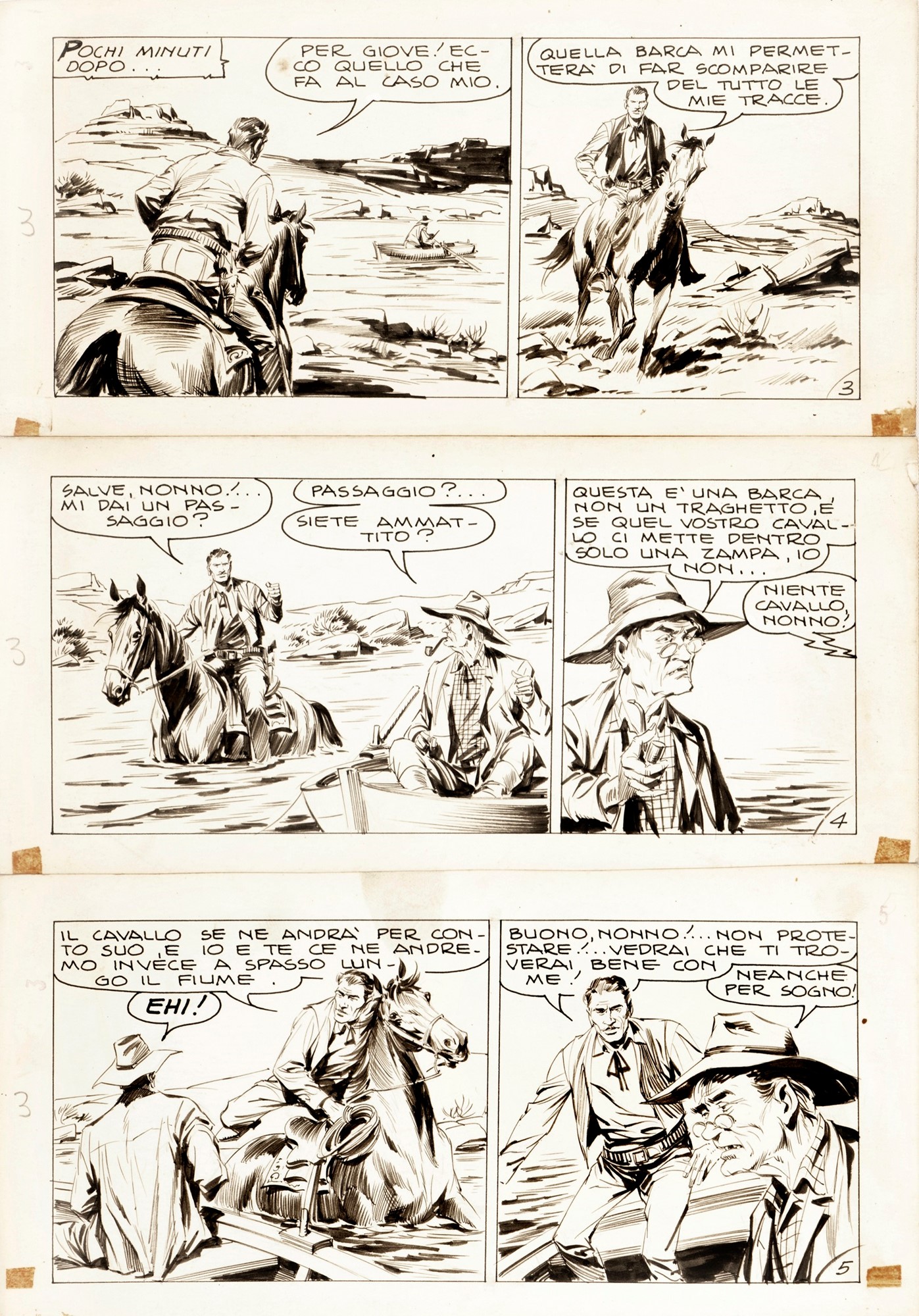 Tavola originale realizzata da Galep per la pag. 2 di "Rapina notturna", edita per la prima volta nel formato a striscia nella Serie Osages n. 3 nel 1963 e successivamente ristampata su Tex n. 61 a pag. 22 dalla Bonelli nel 1965. Su tre pannelli.