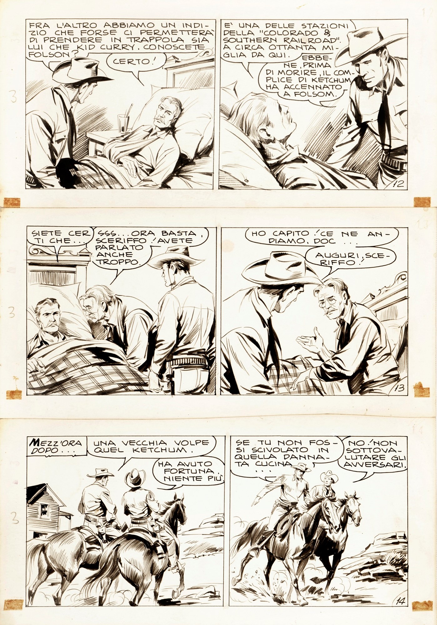 Tavola originale realizzata da Galep per la pag. 5 di "Rapina notturna", edita per la prima volta nel formato a striscia nella Serie Osages n. 3 nel 1963 e successivamente ristampata su Tex n. 61 a pag. 25 dalla Bonelli nel 1965. Su tre pannelli.