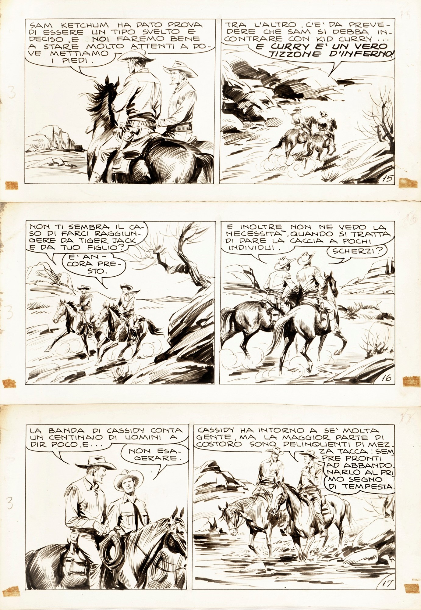 Tavola originale realizzata da Galep per la pag. 6 di "Rapina notturna", edita per la prima volta nel formato a striscia nella Serie Osages n. 3 nel 1963 e successivamente ristampata su Tex n. 61 a pag. 26 dalla Bonelli nel 1965. Su tre pannelli.