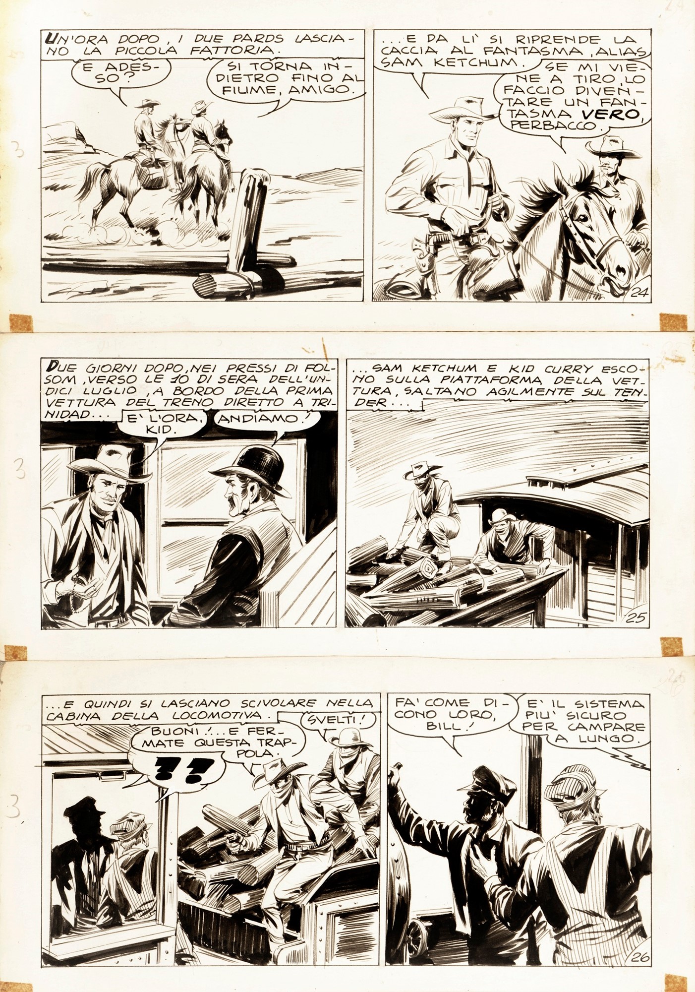 Tavola originale realizzata da Galep per la pag. 9 di "Rapina notturna", edita per la prima volta nel formato a striscia nella Serie Osages n. 3 nel 1963 e successivamente ristampata su Tex n. 61 a pag. 29 dalla Bonelli nel 1965. Su tre pannelli.
