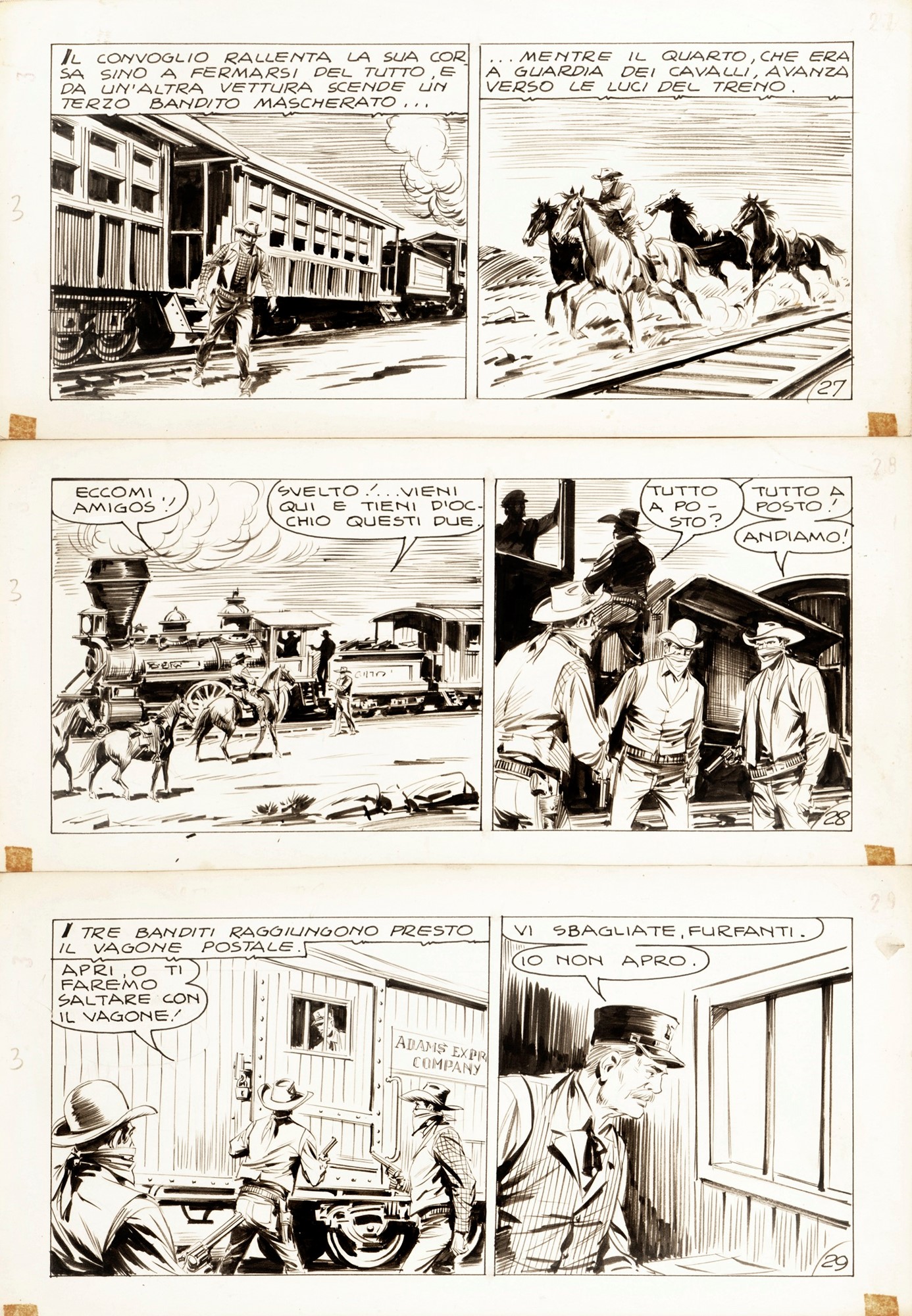 Tavola originale realizzata da Galep per la pag. 10 di "Rapina notturna", edita per la prima volta nel formato a striscia nella Serie Osages n. 3 nel 1963 e successivamente ristampata su Tex n. 61 a pag. 30 dalla Bonelli nel 1965. Su tre pannelli.