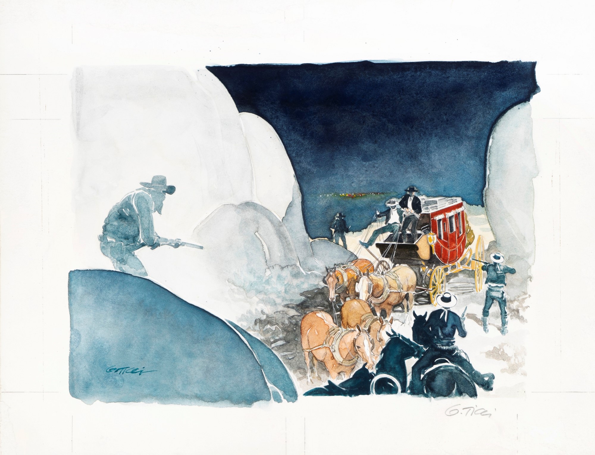 Originale di copertina realizzato da Ticci per il romanzo "La città della paura" di Luke Short, edito nella collana I grandi Western n. 148 dalla casa editrice La Frontiera nel 1988. Firmato.