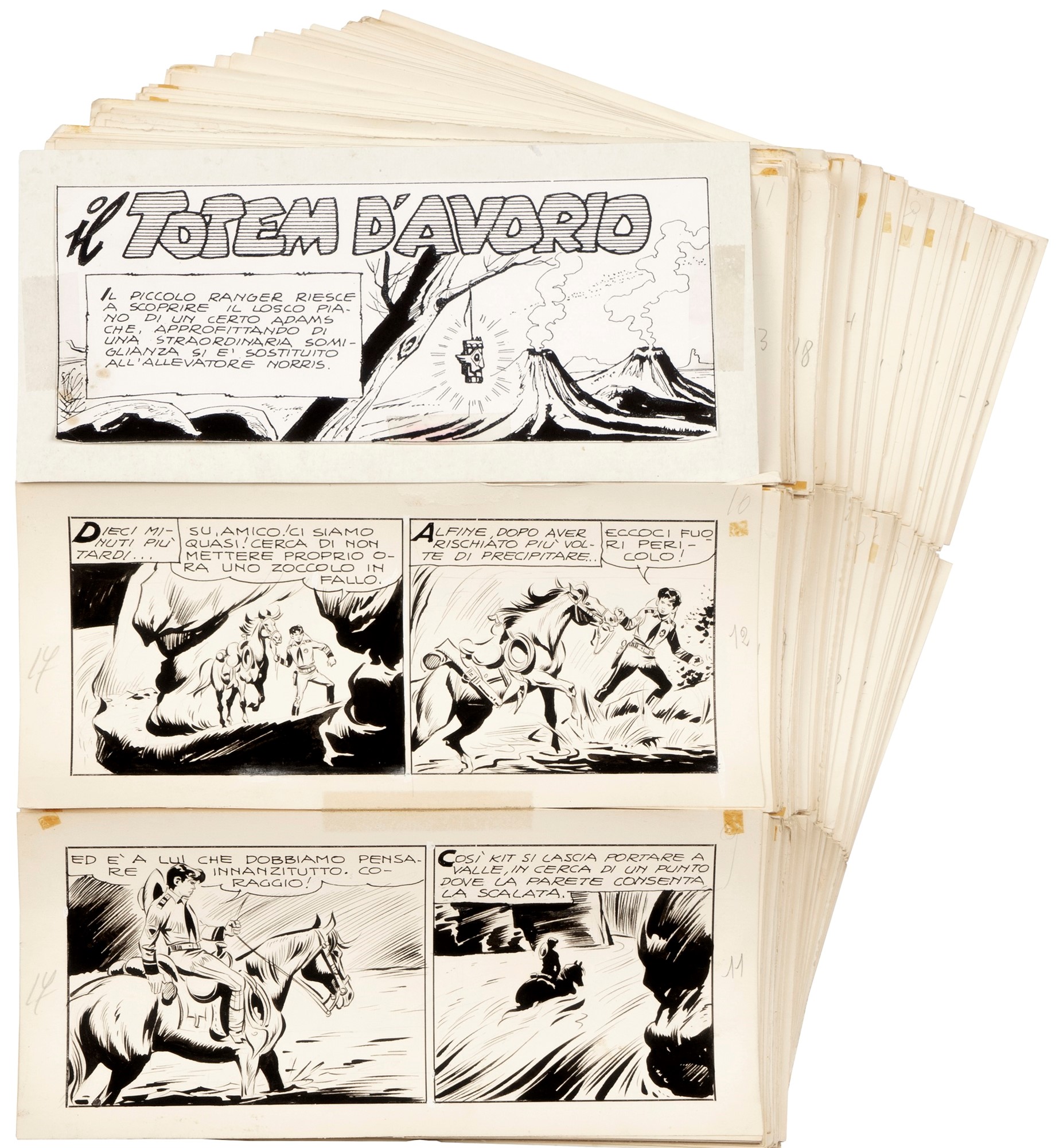 Storia completa composta da 94 tavole originali realizzate da Gamba per "Il totem d’avorio", pubblicata per la prima volta nel formato a strisce nella III Serie di Piccolo Ranger dalle Edizioni Audace nel 1960 e successivamente ristampata nel formato albetto in Piccolo Ranger n. 13 dalla Bonelli nel 1964. Su tre pannelli.