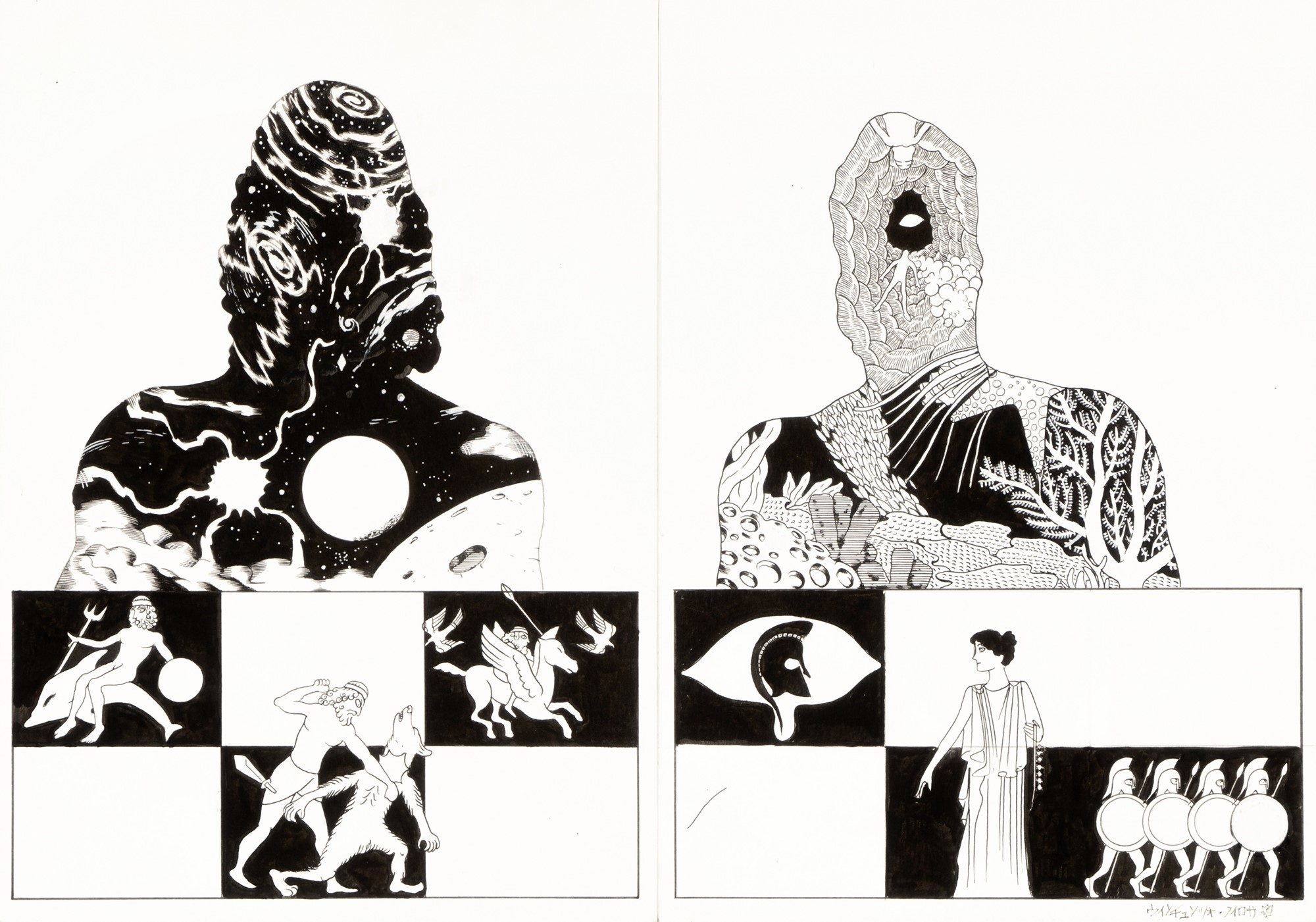 Doppia tavola originale realizzata da Filosa per "Teoria degli opposti", pagg. 6 e 7 di questa affascinante avventura ambientata nel Museo Archeologico Nazionale di Reggio Calabria in cui storia e archeologia si fondono sono il filo conduttore, pubblicata nella collana Fumetti nei Musei dalla Coconino nel 2020. Firmata.