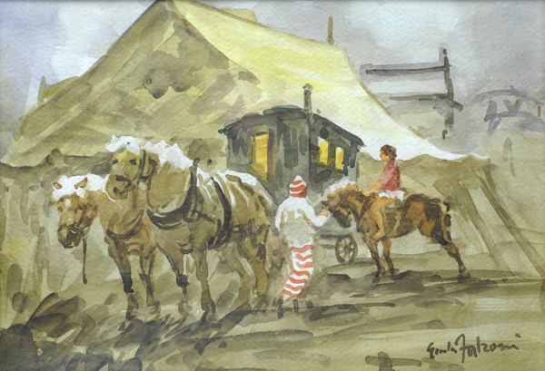 Giulio Falzoni (Marmirolo, 1900 - 1978) DIETRO IL CIRCO Acquarello su carta, cm. 25x35 Timbri della Galleri d’Arte Pedroni - Legnano (MI). Firma in basso a destra.