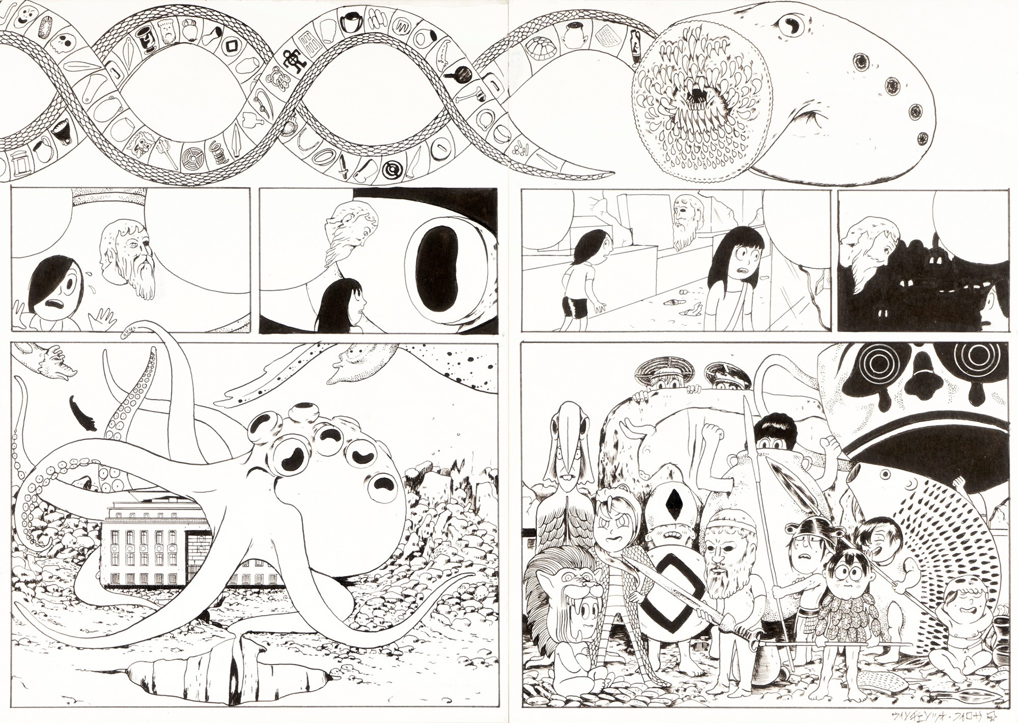 Doppia tavola originale realizzata da Filosa per "Teoria degli opposti", pagg. 14 e 15 di questa affascinante avventura ambientata nel Museo Archeologico Nazionale di Reggio Calabria in cui storia e archeologia si fondono sono il filo conduttore, pubblicata nella collana Fumetti nei Musei dalla Coconino nel 2020. Firmata.