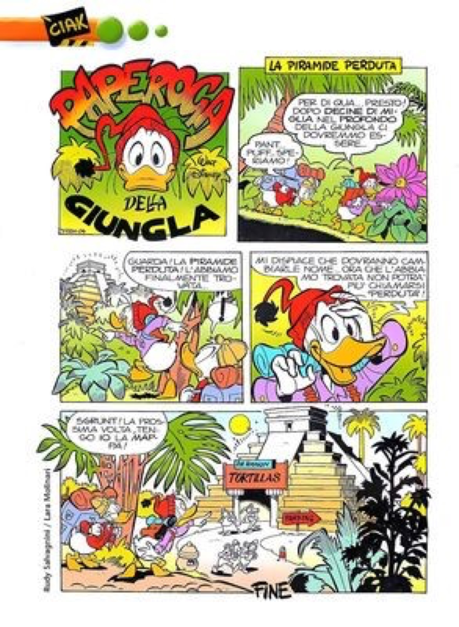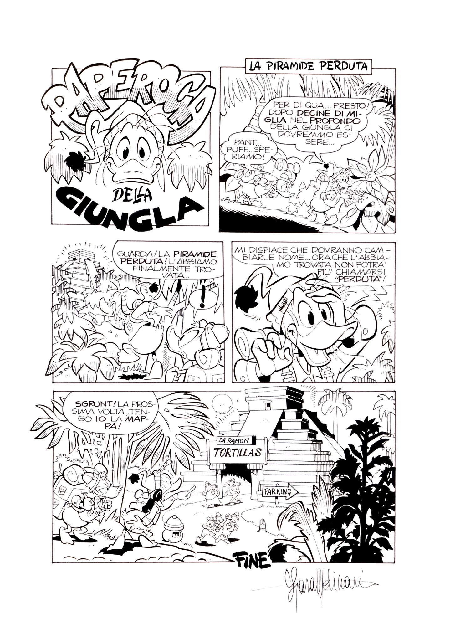 Tavola originale realizzata dalla Molinari per "Paperoga della giungla: La piramide perduta", edita su Topolino n. 2331 nell'Agosto 2000. Firmata.