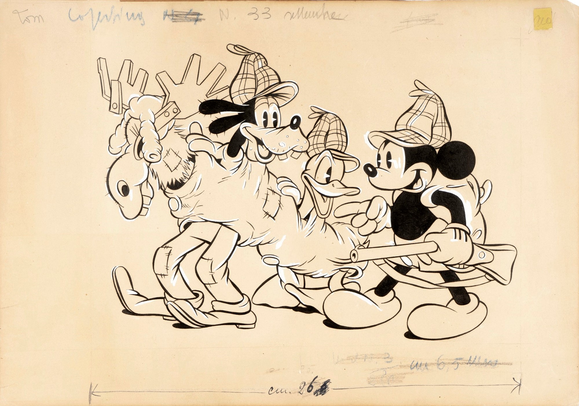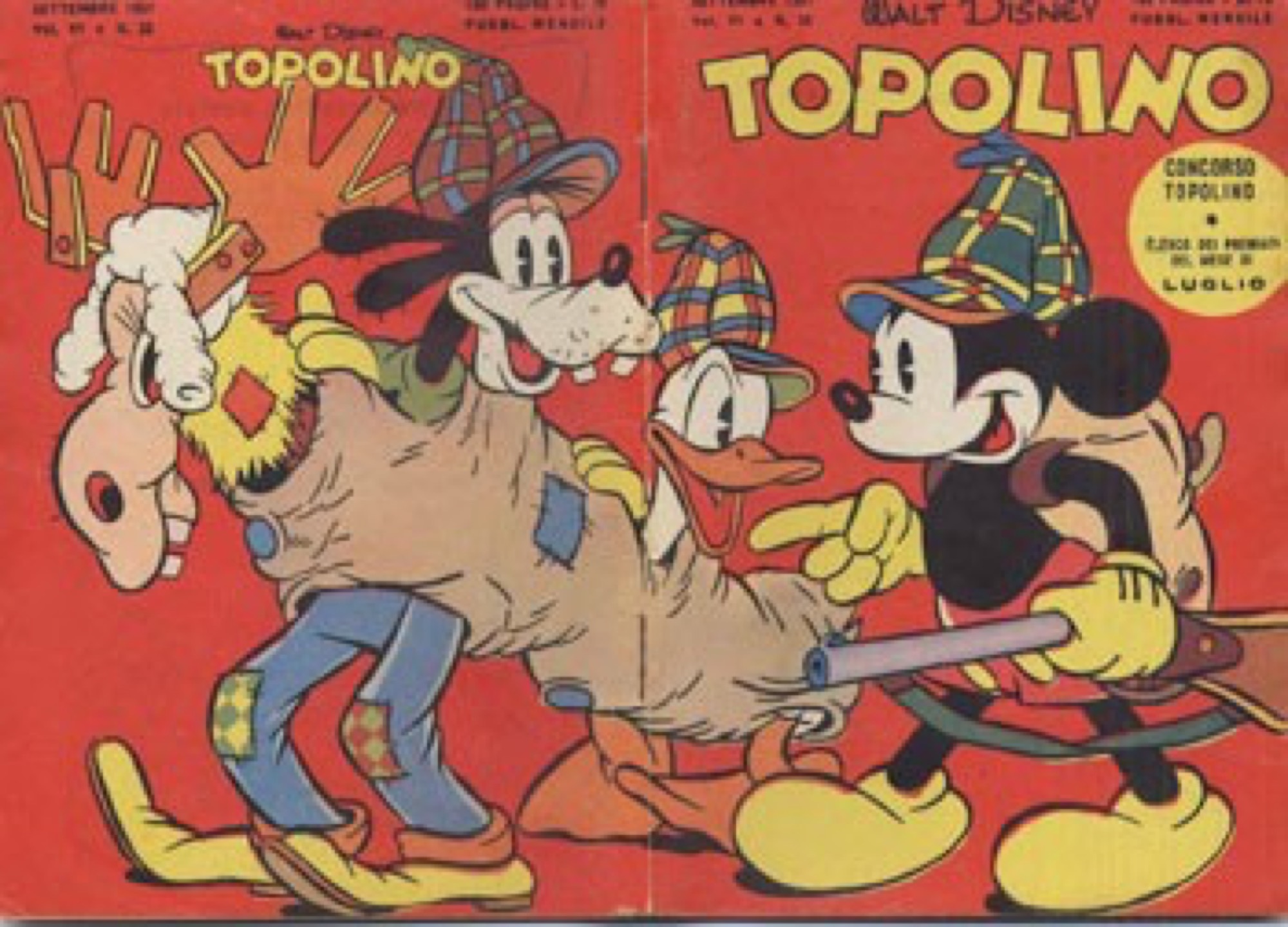 Originale di copertina realizzato da Rubino per Topolino n. 33 edito dalla Mondadori nel Settembre 1951. Rubino fa il suo debutto su Topolino libretto proprio con questa meravigliosa copertina, omaggiando il celebre cortometraggio animato "Caccia all'Alce" ("Moose Hunters") del 1937 . Opera pubblicata recentemente sul catalogo "90 years of magic. Mickey the true original" a pag. 136, pubblicato in occasione dell'omonima mostra tenutasi a Desenzano del Garda nel 2019. Un pezzo da museo.