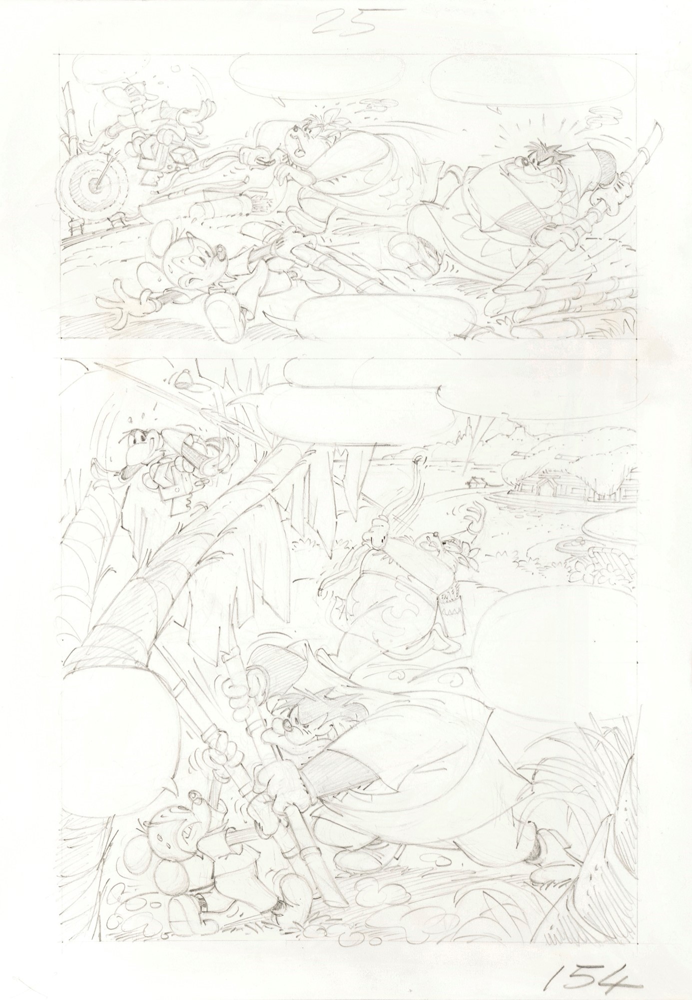 Tavola preliminare a matita realizzata da Scarpa per la pag. 25 di "Paperolimpiadi: Caccia ai ladri", edita su Topolino n. 1709 nell'Agosto 1988.