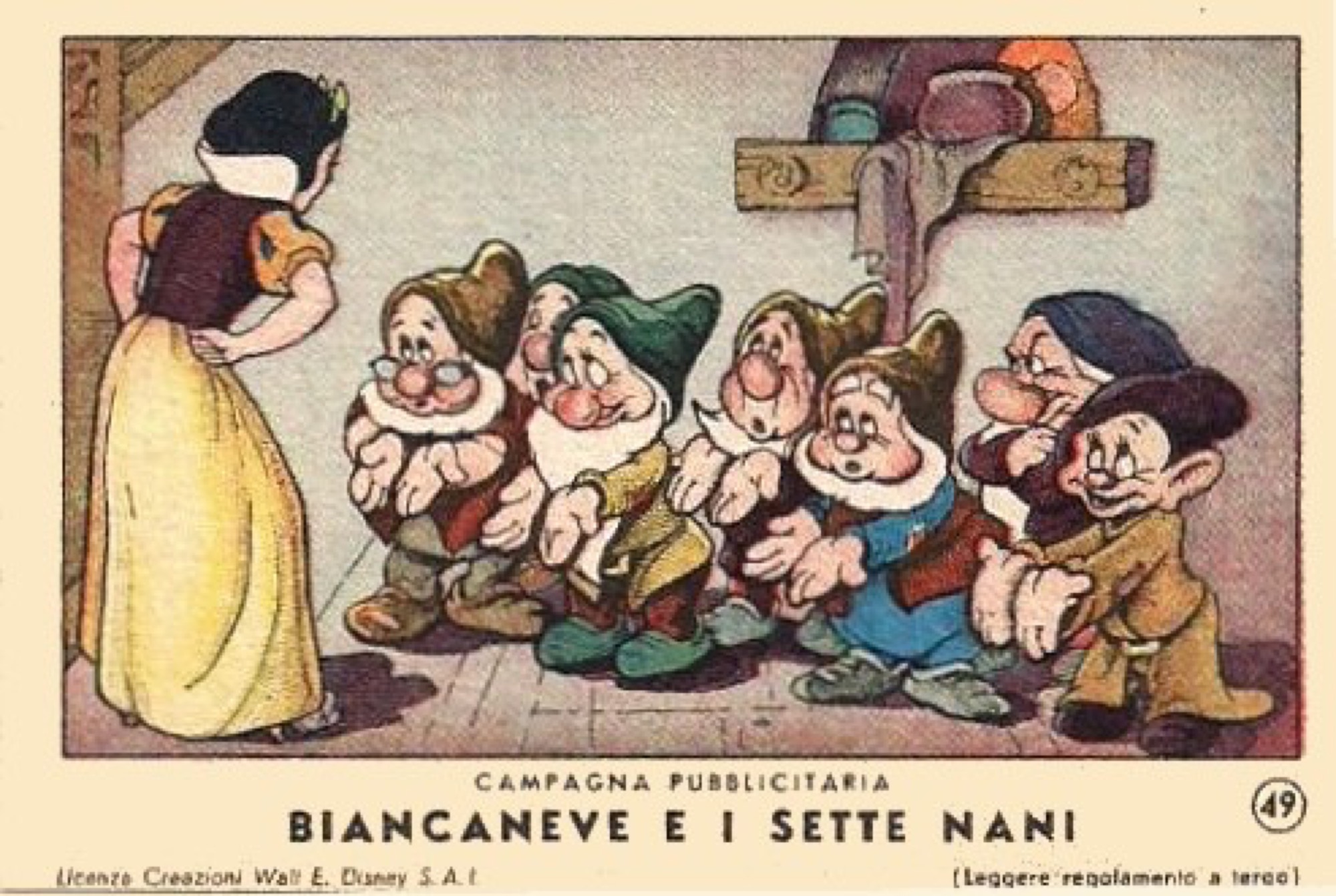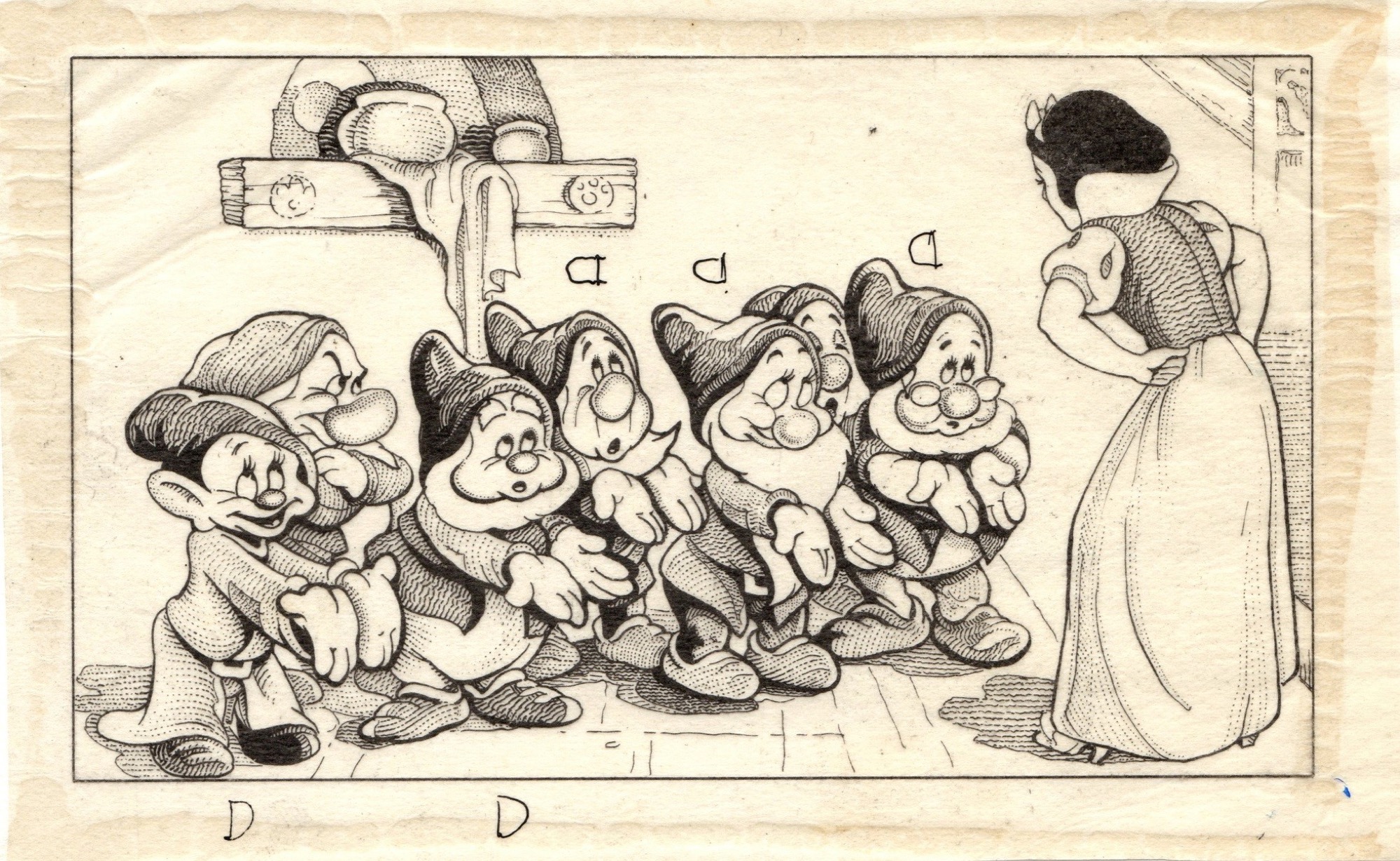 Disegno originale realizzato da Zucchi per la figurina n. 49 della raccolta per il concorso Elah "Biancaneve e i sette nani", distribuita in omaggio con i prodotti Elah nel 1939 e prodotte dalla Gros Monti&C di Torino, unico concessionario Disney in Italia dell´epoca.