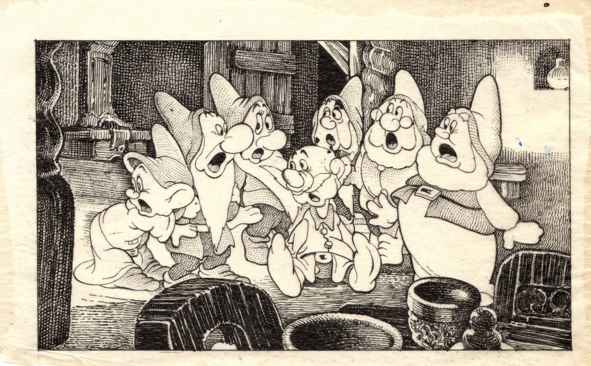 Disegno originale realizzato da Zucchi per una figurina della raccolta per il concorso Elah "Biancaneve e i sette nani", distribuita in omaggio con i prodotti Elah nel 1939 e prodotte dalla Gros Monti&C di Torino, unico concessionario Disney in Italia dell´epoca.