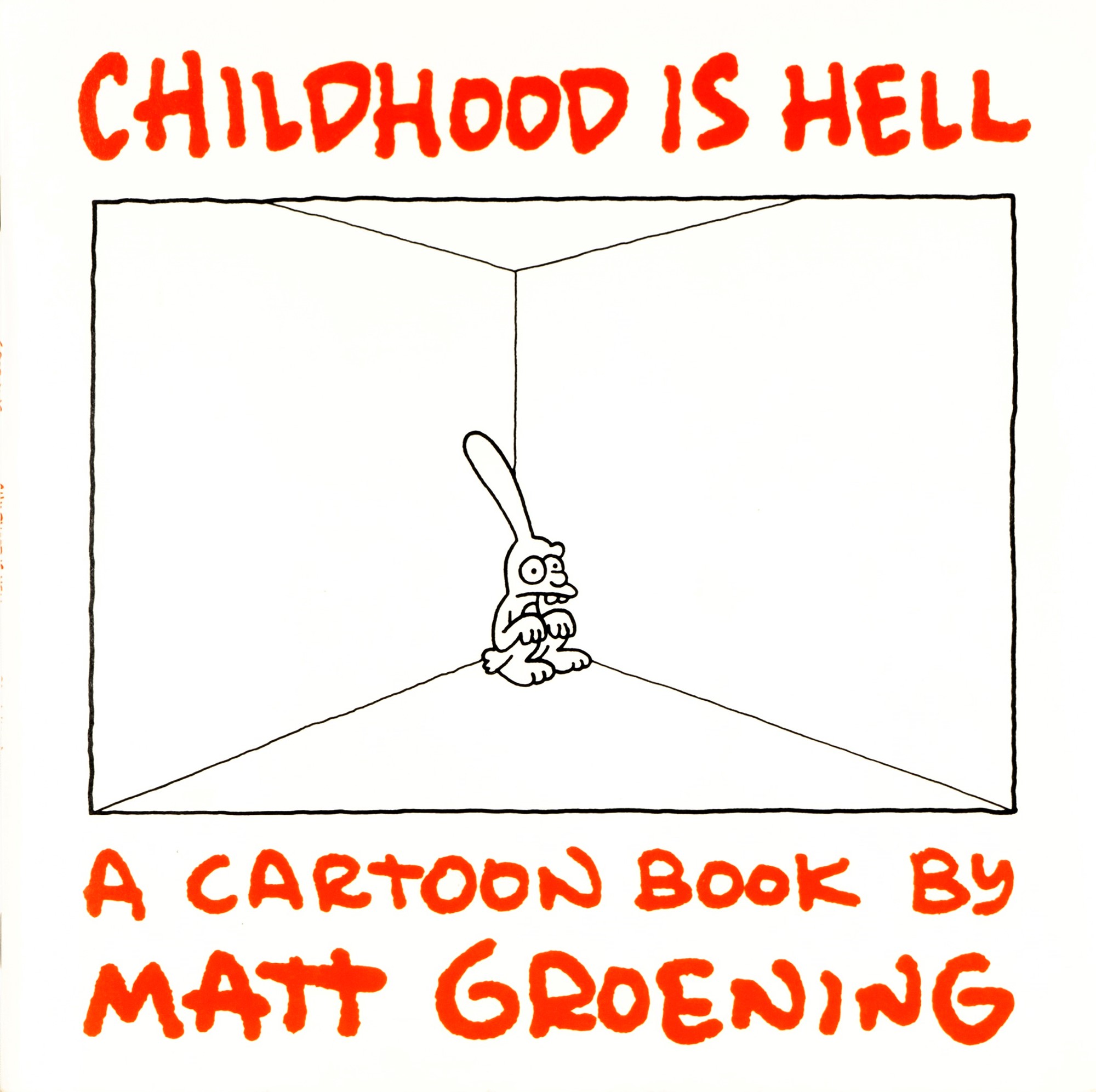 Disegno originale realizzato da Groening nella seconda di copertina del volume "Childhood Is Hell", raccolta di strip e disegni realizzati tra il 1983-86 in cui il protagonista è sempre il coniglietto antropomorfo che sarà il prototipo per i futuri Simpson. Firmato, datato e dedicato.