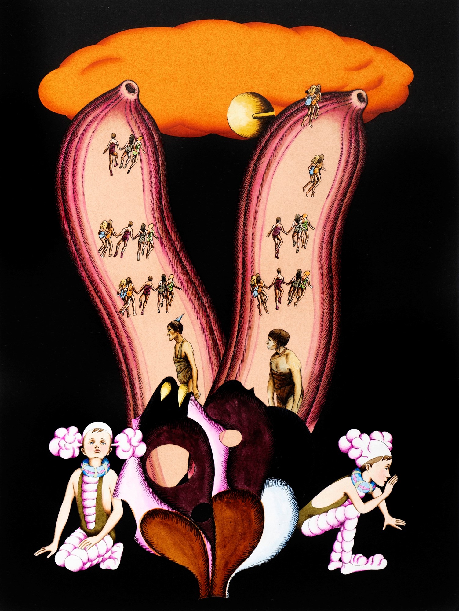 Disegno di produzione realizzato da Topor per il film d'animazione "Il pianeta selvaggio", diretto da René Laloux nel 1973, insignito del premio speciale al 26° Festival di Cannes. Uno dei più grandi capolavori dell'animazione di tutti i tempi, una vera e propria opera d'arte dai contenuti forti e carichi di poesia, Il pianeta selvaggio è frutto della collaborazione tra il regista francese René Laloux e il poliedrico artista Roland Topor che ha curato tutta la parte grafica del film, realizzando una sorta di incrocio tra il Surrealismo di Salvador Dalì e l'immaginario esoterico e bizzarro di Hieronymus Bosch, il tutto caratterizzato da un'animazione rigida che ricorda i deliri cartooneschi realizzati da Terry Gilliam per i Monty Python.