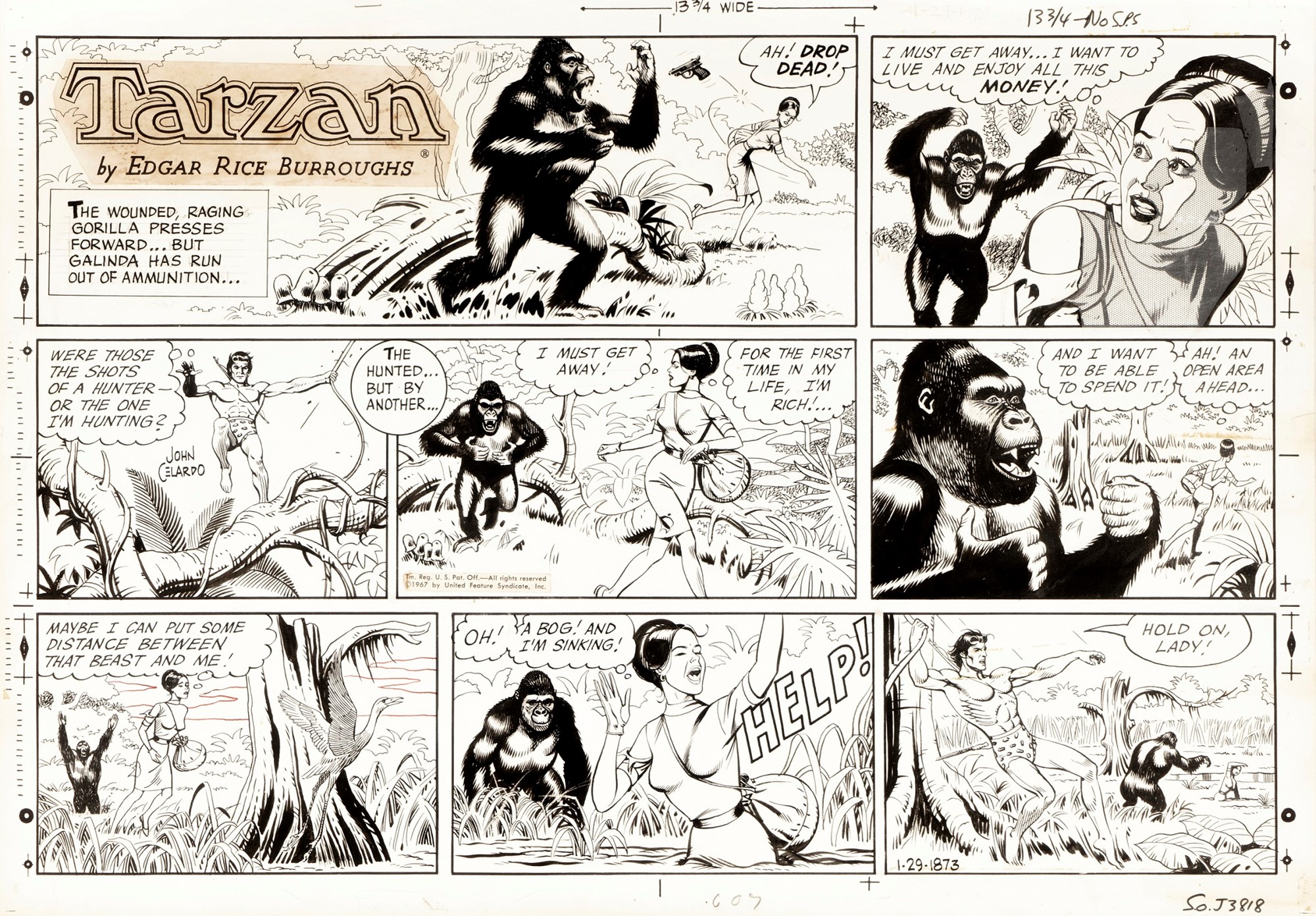 Tavola domenicale del 29/01/1967 per "Tarzan". Una fanciulla in difficoltà, un gorilla impazzito, il re della giungla pronto ad intervenire; c'è davvero tutto in questa superba tavola di Tarzan. Timbro dell'artista al retro. Firmata e datata.
