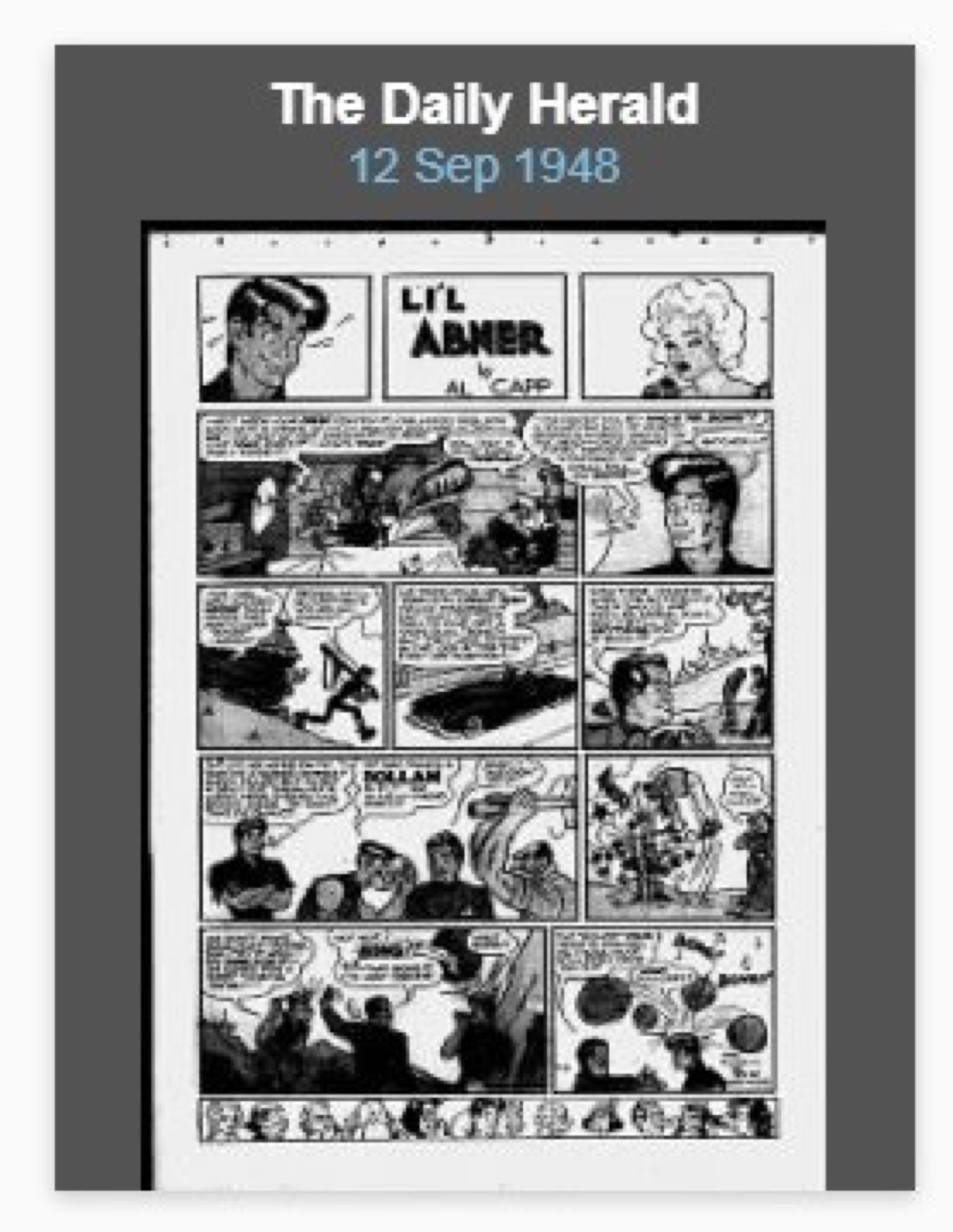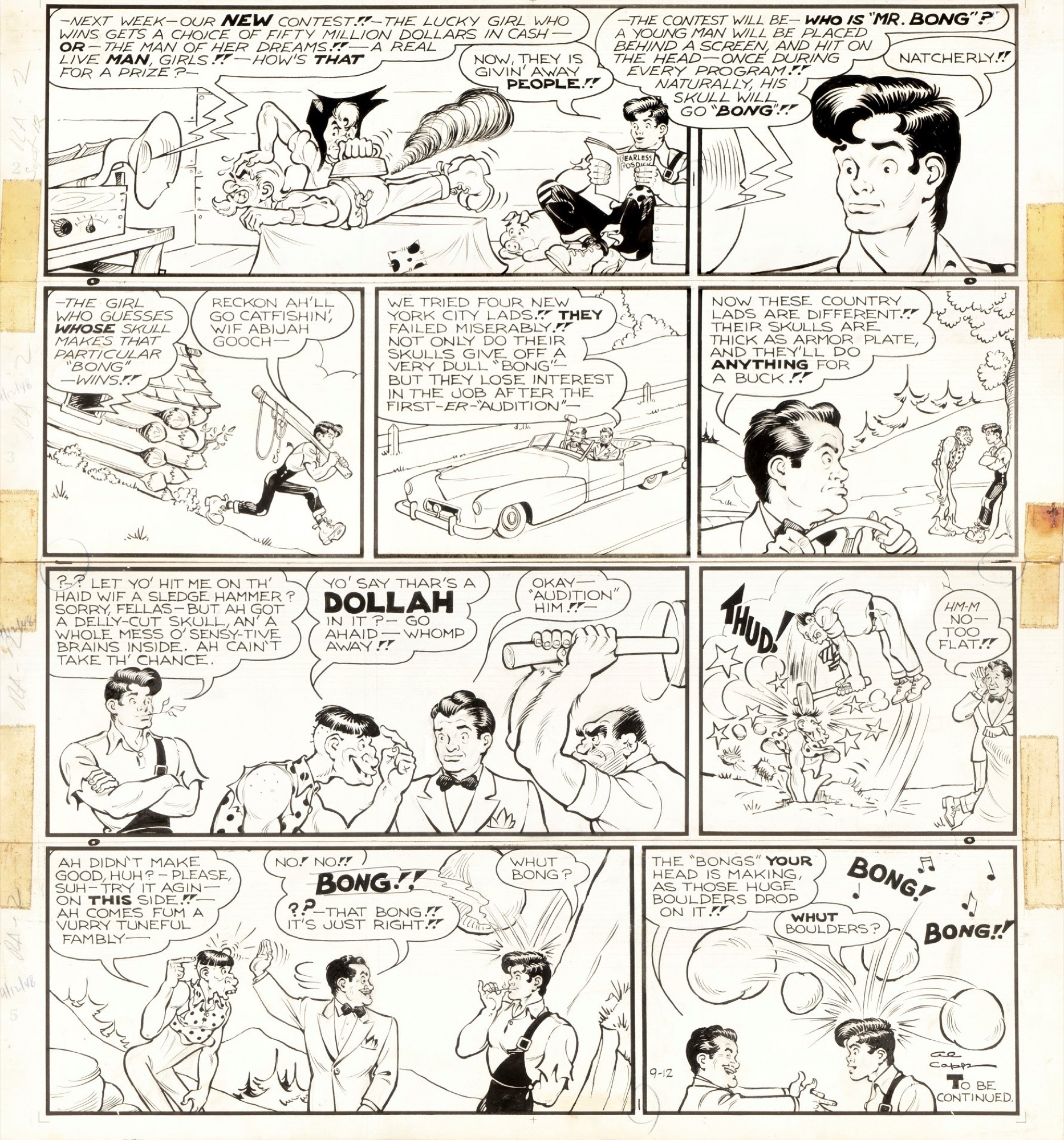 Tavola domenicale del 12/09/1948 per "Li'l Abner". Un impresario di New York, con le fattezze dello stesso Al Capp, va in campagna alla ricerca di un cranio che faccia "Bong"...non "Thud". Su quattro pannelli. Firmata e datata.