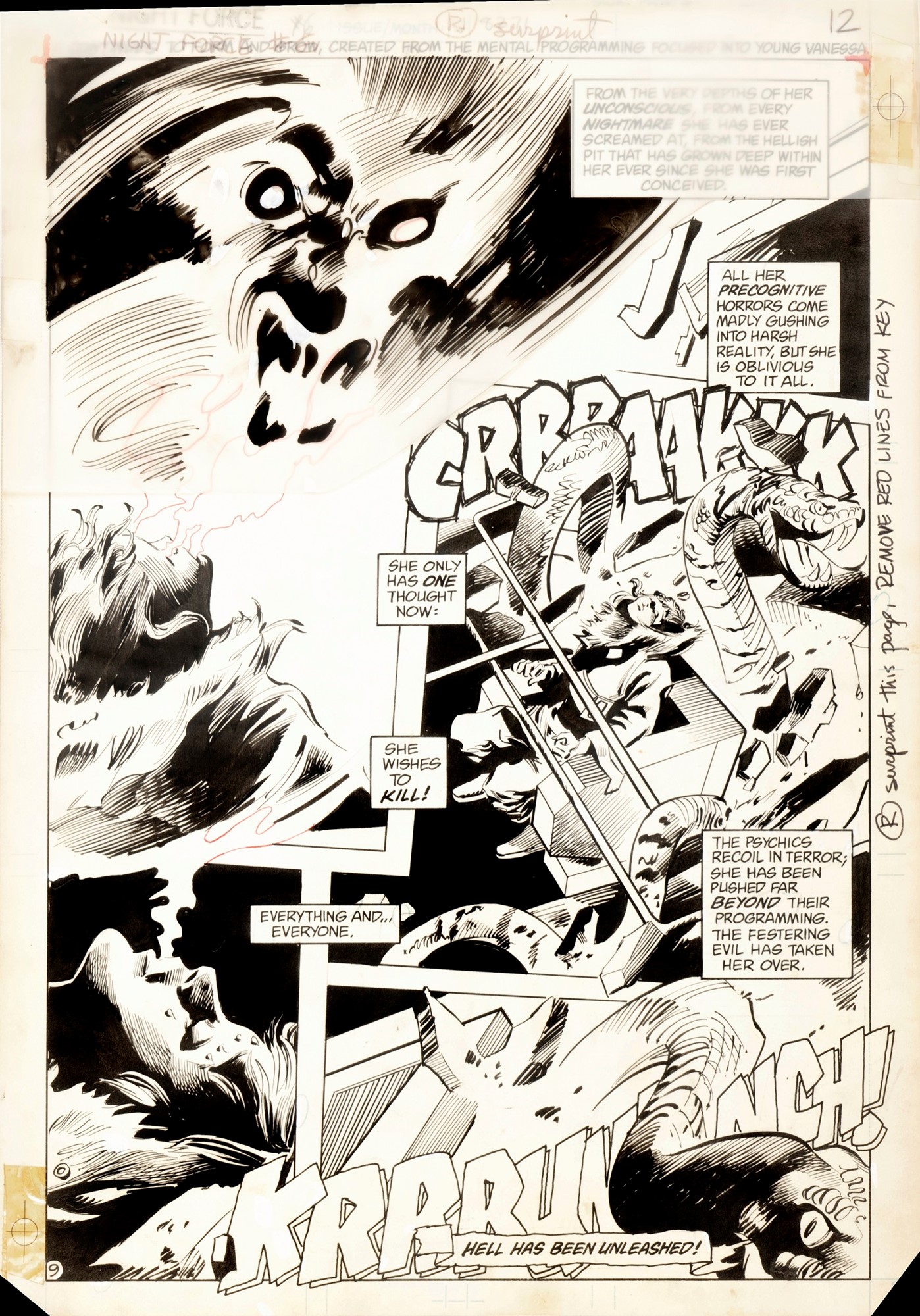 Tavola originale realizzata da Colan per "The Devil Her Due", edita su Night Force n. 6 a pag. 9 dalla DC nel 1983. L'immagine del demone è a china su lucido. Timbro editoriale al retro.