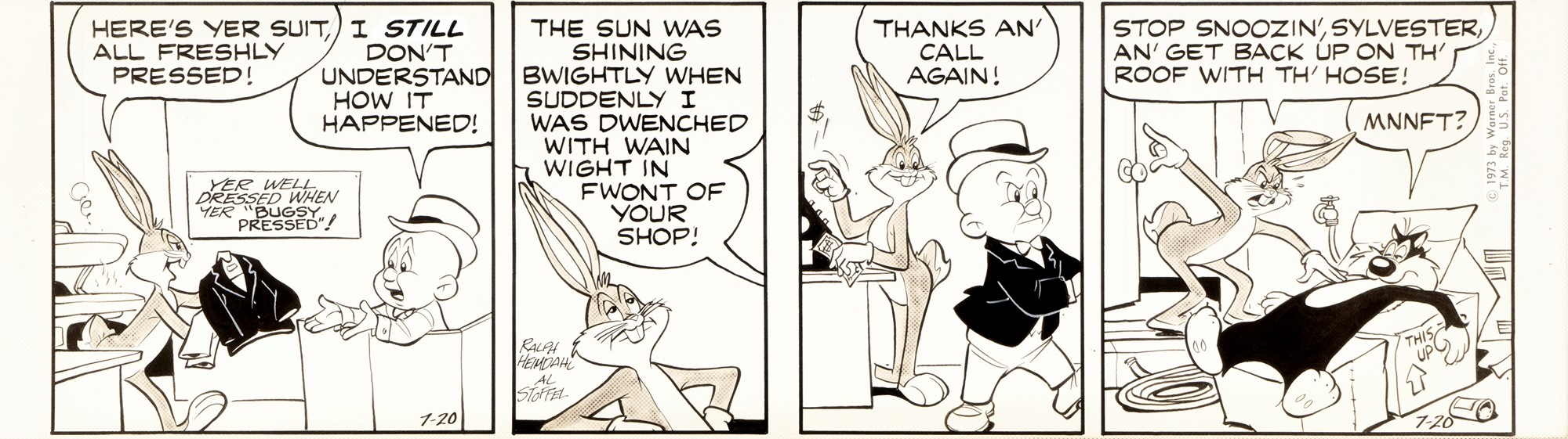 Striscia giornaliera del 20/07/1973 per "Bugs Bunny". Di notevole rarità la presenza di gatto Silvestro nelle avventure del simpatico coniglio. Firmata e datata.