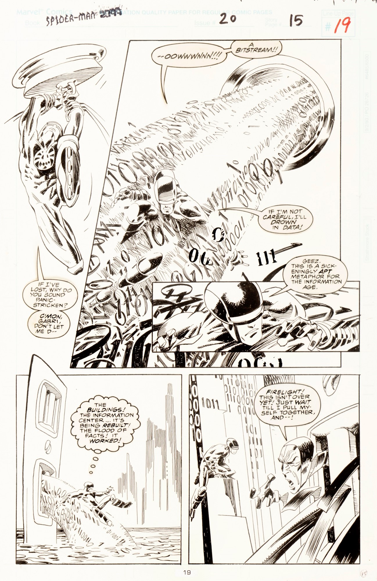 Tavola originale realizzata da Leonardi per "Crash and Burn", edita su Spider-Man 2099 n. 20 a pag. 19 dalla Marvel nel 1994.