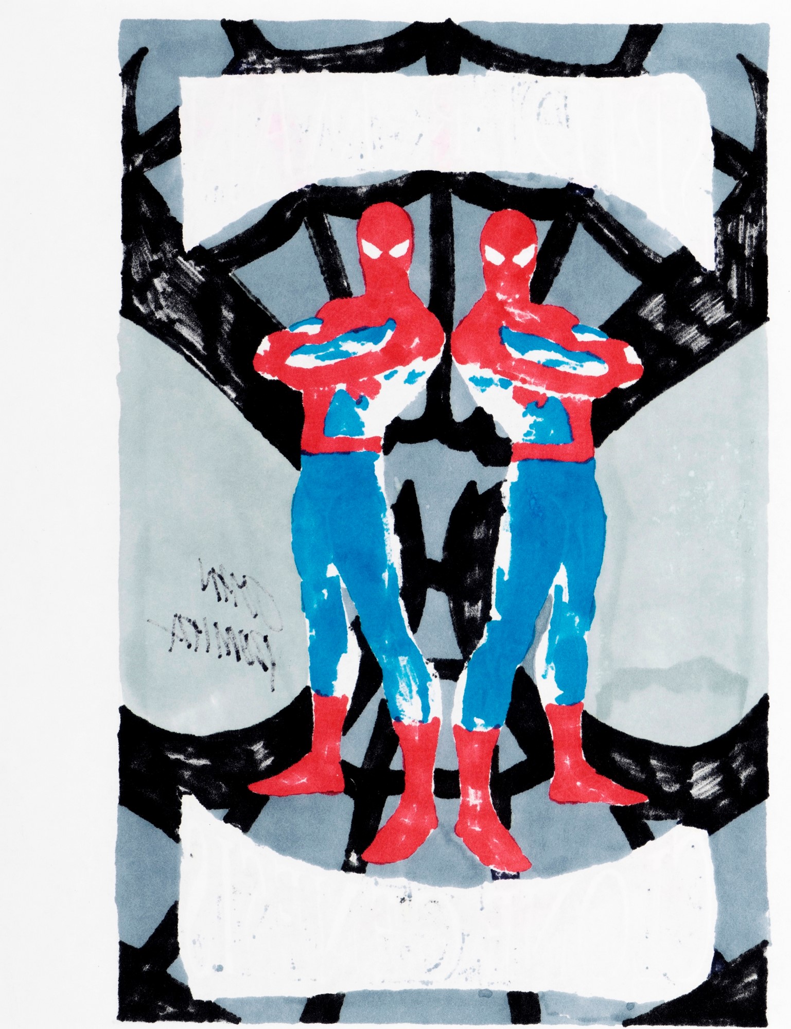 Preliminare di copertina realizzato da Romita Sr. per il volume "Spider-Man: Clone Genesis", edito dalla Marvel nel 1995. Romita si è basato su una sua tipica immagine anni '80 di Spidey, riproducendo in fotocopia l'immagine specchiata di Spider-Man andando poi a completarla disegnando lo sfondo e il titolo, colorando poi il tutto. Proveniente dall'archivio dell'autore. Firmato.
