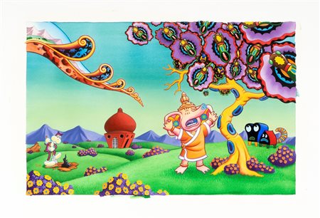 Illustrazione originale realizzata da Woodring per i risguardi del volume "The Lute String", edito dalla PressPop Gallery nel 2005. Una delle opere più ispirate del genio visionario di Woodring, un'esplosione di colori. Firmata.