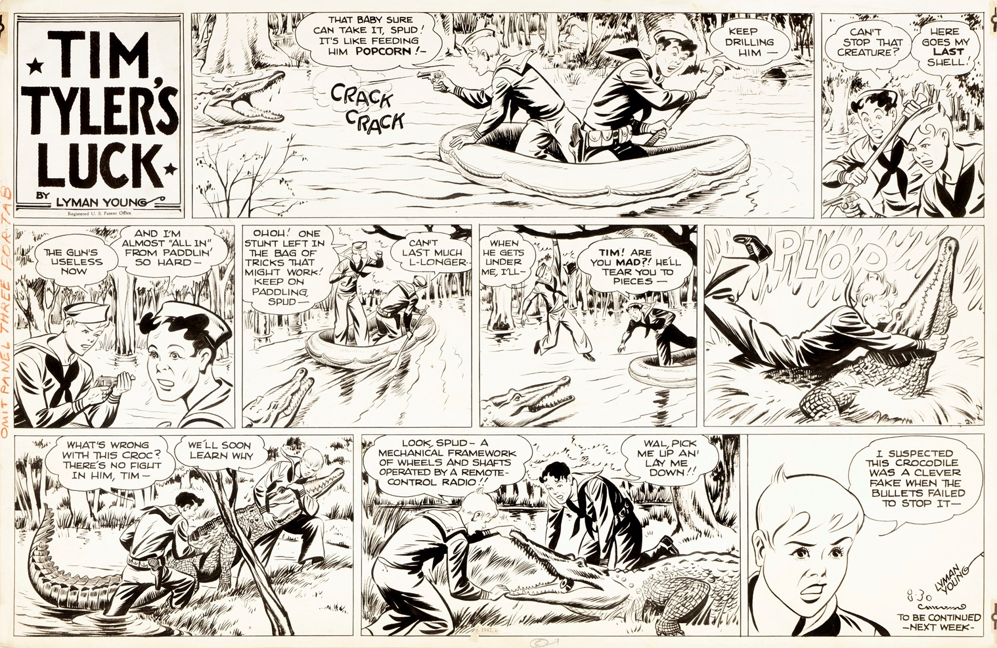 Tavola domenicale del 30/08/1942 per "Tim Tyler's Luck". Apparsa per la prima volta come striscia giornaliera nell'agosto del 1928, la serie approdò in Italia nel 1933 su Topolino giornale e riscosse un così grande successo che l'editore Nerbini decise di dedicargli una testata incentrata sui due protagonisti della serie, "Il giornale di Cino e Franco". Insieme a Young, collaborarono molti giovani artisti, tra cui Alex Raymond e Burne Hogarth. Firmata e datata.