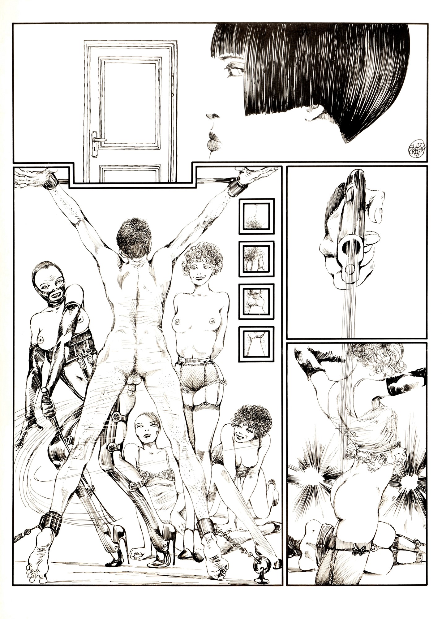 Tavola originale realizzata da Crepax per la pag. 86 di "Lanterna magica", avventura della sensuale Valentina edita dalla Editiemme nel 1979. In quella che è da considerarsi una delle opere più oniriche del maestro milanese, Valentina insonne si appisola e si risveglia e, nel suo dormiveglia, flusso di coscienza e sogno si intrecciano in un susseguirsi di visioni tra stralci di narrazione, discontinuità improvvise e virtuosismi grafici. Firmata e datata.