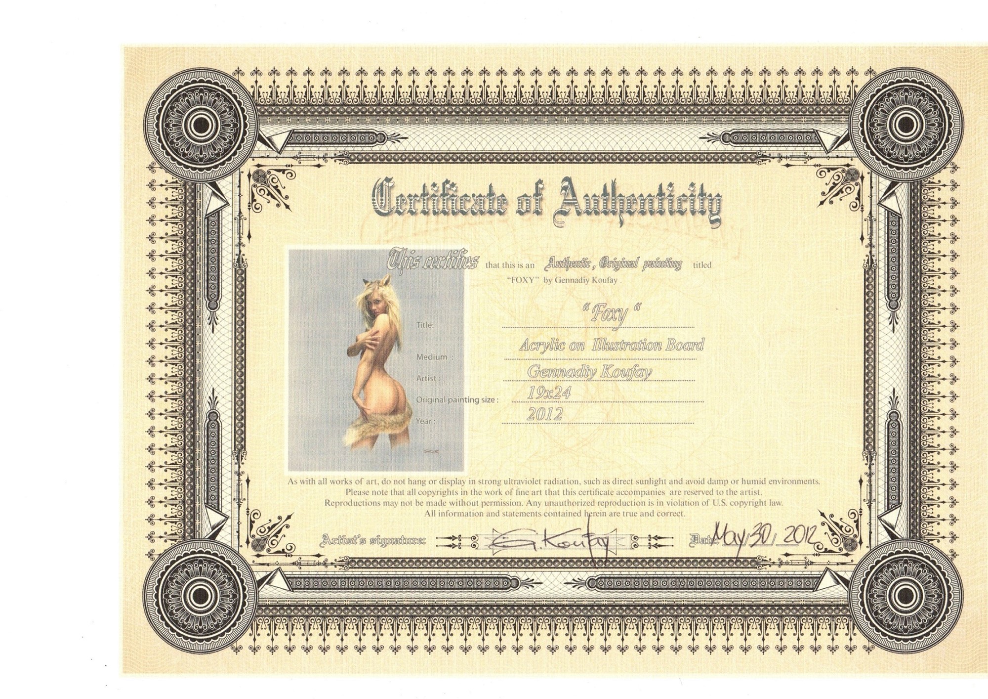 Illustrazione originale realizzata dal maestro europeo delle pin-up Koufay, titolata "Foxy". Si allega il C.o.a. rilasciato dall´artista. Firmata.