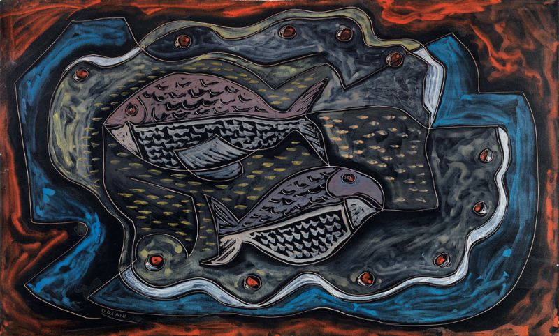 Pippo Oriani Torino 1909 - Roma 1972 Pesci, anni Sessanta Encausto e graffito su cartone, cm. 30x50 Firma in basso a sinistra: Oriani; al verso: "Pesci" encausto e graffito / periodo parigino - è mio / Pippo Oriani; su un cartone di supporto: etichetta e timbro Galleria Tortora, Ferrara. Certificato su foto Fondation Pippo Oriani, 3 giugno 2002, con n. 212.