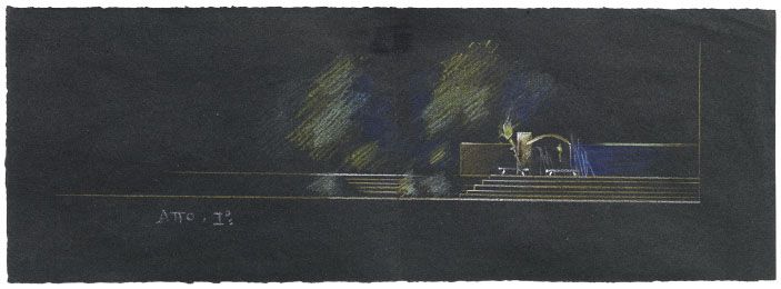 Enrico Prampolini Modena 1894 - Roma 1956 Scalinata e corpo di guardia, (1942) Pastelli su carta nera, cm. 12,5x35,1 Scritta in basso a sinistra: Atto I. Al verso, su un cartone di supporto: timbro ed etichetta con n. 9166 Arte Centro, Milano (opera datata 1942).