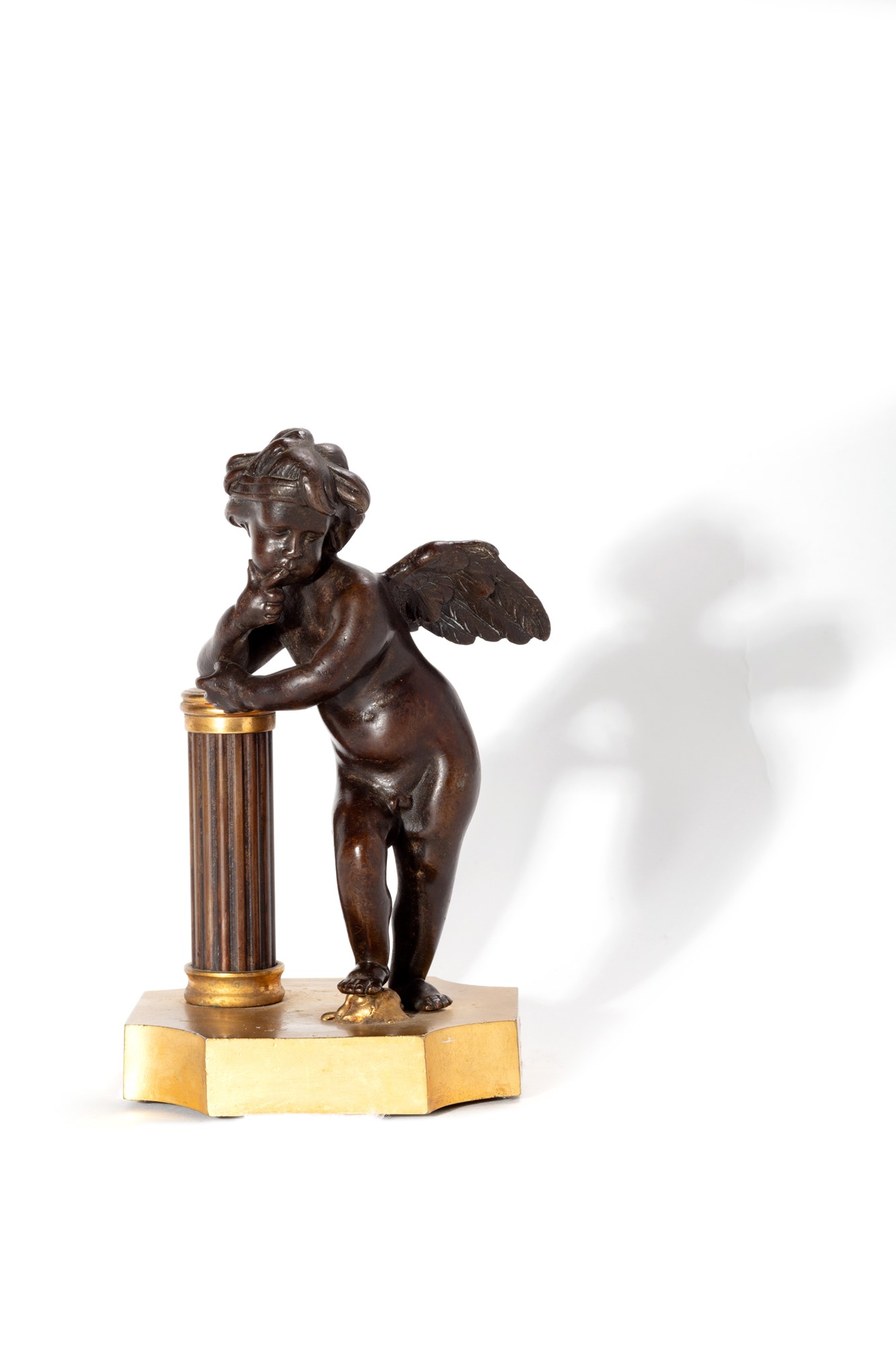 Scultura in bronzo a patina scura raffigurante Angioletto appoggiato a una colonna, secolo XIX