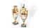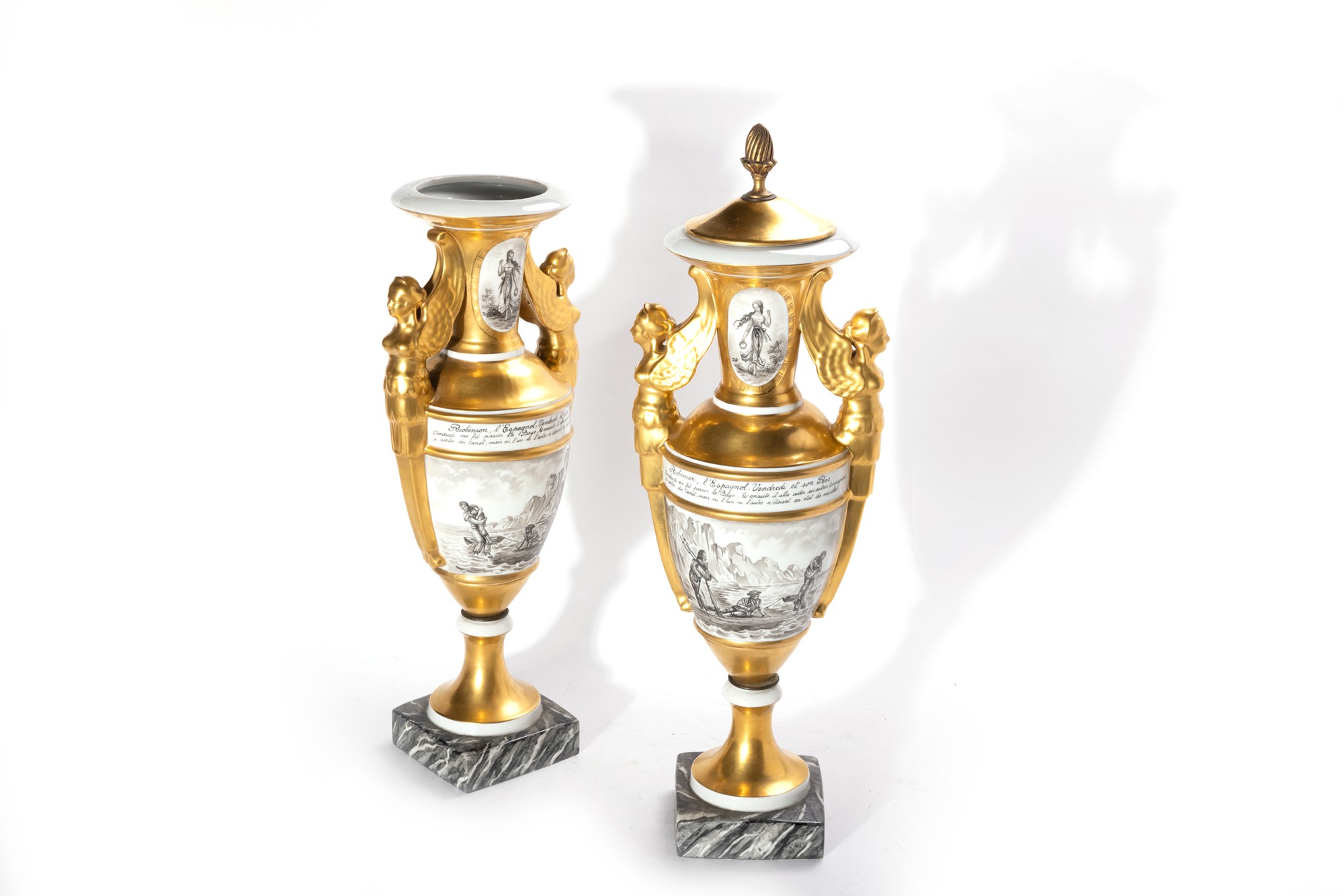 Coppia di vasi in porcellana bianca e oro, dipinti in bianco e nero con scene dal Robinson Crusoe di Daniel Defoe, Francia, fine secolo XIX -inizi secolo XX