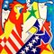 Firmato, datato. VIGLIATURO SILVIO - Nato ad Acri nel 1949. Dipinto olio su compensato intitolato ''MESCOLANZE, U.S.A., IL MITO (IL LITIGIO DELLE COLOMBE)''. Con autentica dell'artista su fotografia. Mis. Lung. cm. 100 Alt. cm. 100 ca.