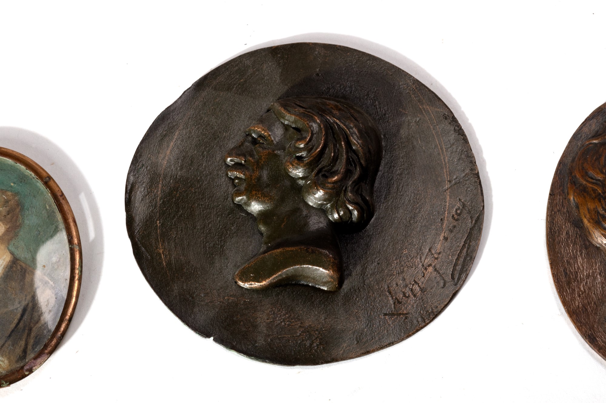 Lotto composto da 11 placche in materiali diversi con profili di personaggi illustri, fine secolo XIX - inizi secolo XX
