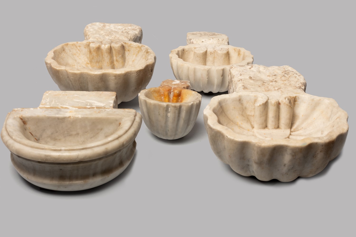 Lotto 443 | Lotto di cinque antiche acquasantiere in marmo